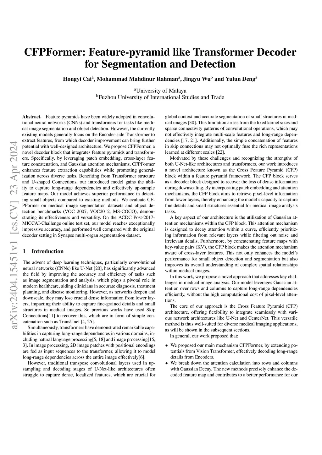 Feature pyramids have been widely adopted in convolutional neural networks and transformers for tasks in medical image segmentation. However, existing models generally focus on the Encoder-side Transformer for feature extraction. We further explore the potential in improving the feature decoder with a well-designed architecture. We propose Cross Feature Pyramid Transformer decoder (CFPFormer), a novel decoder block that integrates feature pyramids and transformers. Even though transformer-like architecture impress with outstanding performance in segmentation, the concerns to reduce the redundancy and training costs still exist. Specifically, by leveraging patch embedding, cross-layer feature concatenation mechanisms, CFPFormer enhances feature extraction capabilities while complexity issue is mitigated by our Gaussian Attention. Benefiting from Transformer structure and U-shaped connections, our work is capable of capturing long-range dependencies and effectively up-sample feature maps. Experimental results are provided to evaluate CFPFormer on medical image segmentation datasets, demonstrating the efficacy and effectiveness. With a ResNet50 backbone, our method achieves 92.02\% Dice Score, highlighting the efficacy of our methods. Notably, our VGG-based model outperformed baselines with more complex ViT and Swin Transformer backbone.