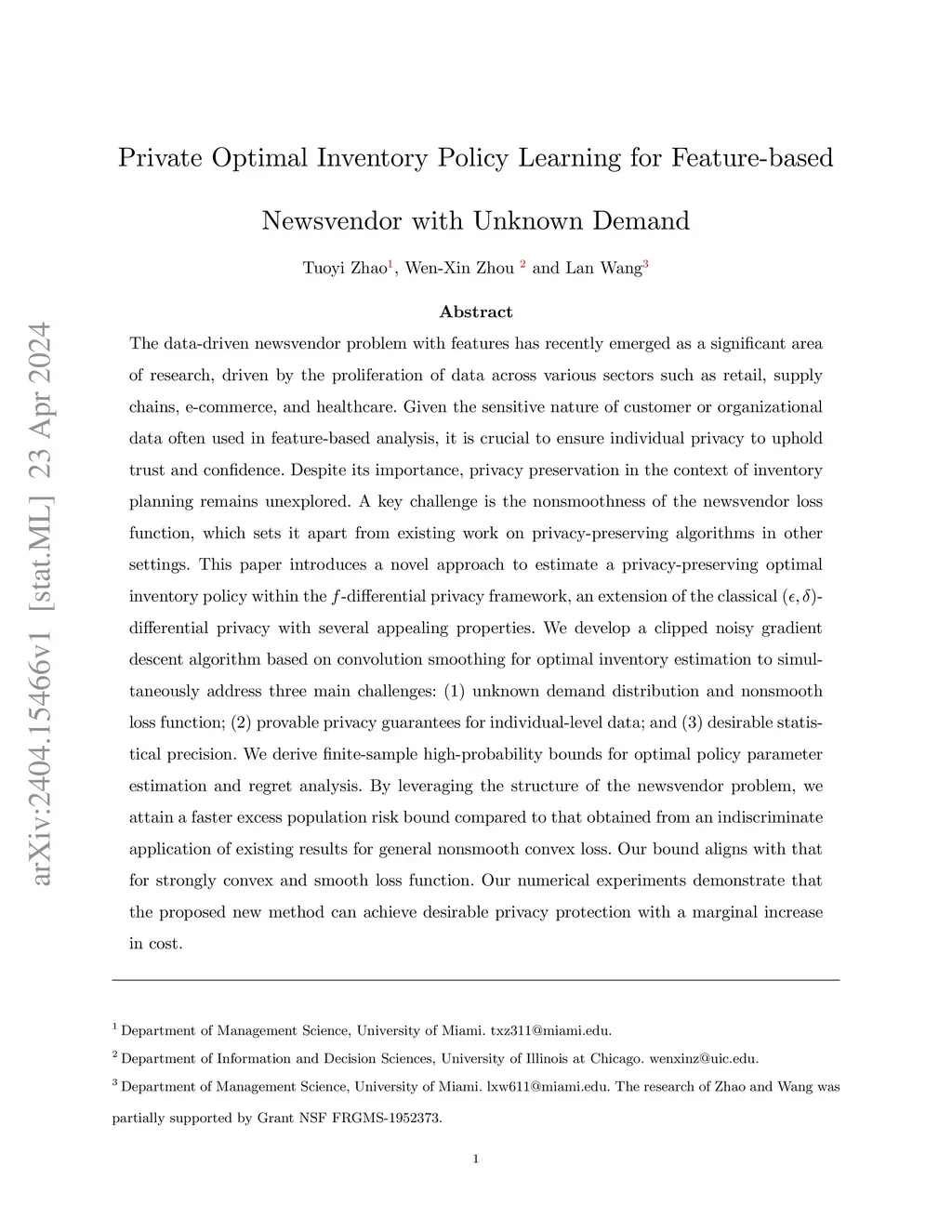 The data-driven newsvendor problem with features has recently emerged as a significant area of research, driven by the proliferation of data across various sectors such as retail, supply chains, e-commerce, and healthcare. Given the sensitive nature of customer or organizational data often used in feature-based analysis, it is crucial to ensure individual privacy to uphold trust and confidence. Despite its importance, privacy preservation in the context of inventory planning remains unexplored. A key challenge is the nonsmoothness of the newsvendor loss function, which sets it apart from existing work on privacy-preserving algorithms in other settings. This paper introduces a novel approach to estimate a privacy-preserving optimal inventory policy within the f-differential privacy framework, an extension of the classical -differential privacy with several appealing properties. We develop a clipped noisy gradient descent algorithm based on convolution smoothing for optimal inventory estimation to simultaneously address three main challenges: (1) unknown demand distribution and nonsmooth loss function; (2) provable privacy guarantees for individual-level data; and (3) desirable statistical precision. We derive finite-sample high-probability bounds for optimal policy parameter estimation and regret analysis. By leveraging the structure of the newsvendor problem, we attain a faster excess population risk bound compared to that obtained from an indiscriminate application of existing results for general nonsmooth convex loss. Our bound aligns with that for strongly convex and smooth loss function. Our numerical experiments demonstrate that the proposed new method can achieve desirable privacy protection with a marginal increase in cost.