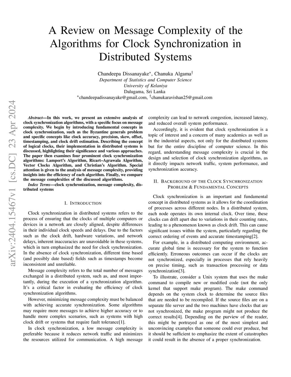 In this work, we present an extensive analysis of clock synchronization algorithms, with a specific focus on message complexity. We begin by introducing fundamental concepts in clock synchronization, such as the Byzantine generals problem and specific concepts like clock accuracy, precision, skew, offset, timestamping, and clock drift estimation. Describing the concept of logical clocks, their implementation in distributed systems is discussed, highlighting their significance and various approaches. The paper then examines four prominent clock synchronization algorithms: Lamport's Algorithm, Ricart-Agrawala Algorithm, Vector Clocks Algorithm, and Christian's Algorithm. Special attention is given to the analysis of message complexity, providing insights into the efficiency of each algorithm. Finally, we compare the message complexities of the discussed algorithms.