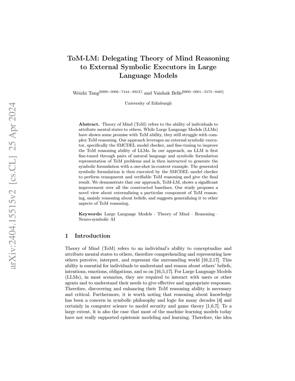 Theory of Mind (ToM) refers to the ability of individuals to attribute mental states to others. While Large Language Models (LLMs) have shown some promise with ToM ability, they still struggle with complex ToM reasoning. Our approach leverages an external symbolic executor, specifically the SMCDEL model checker, and fine-tuning to improve the ToM reasoning ability of LLMs. In our approach, an LLM is first fine-tuned through pairs of natural language and symbolic formulation representation of ToM problems and is then instructed to generate the symbolic formulation with a one-shot in-context example. The generated symbolic formulation is then executed by the SMCDEL model checker to perform transparent and verifiable ToM reasoning and give the final result. We demonstrate that our approach, ToM-LM, shows a significant improvement over all the constructed baselines. Our study proposes a novel view about externalizing a particular component of ToM reasoning, mainly reasoning about beliefs, and suggests generalizing it to other aspects of ToM reasoning.