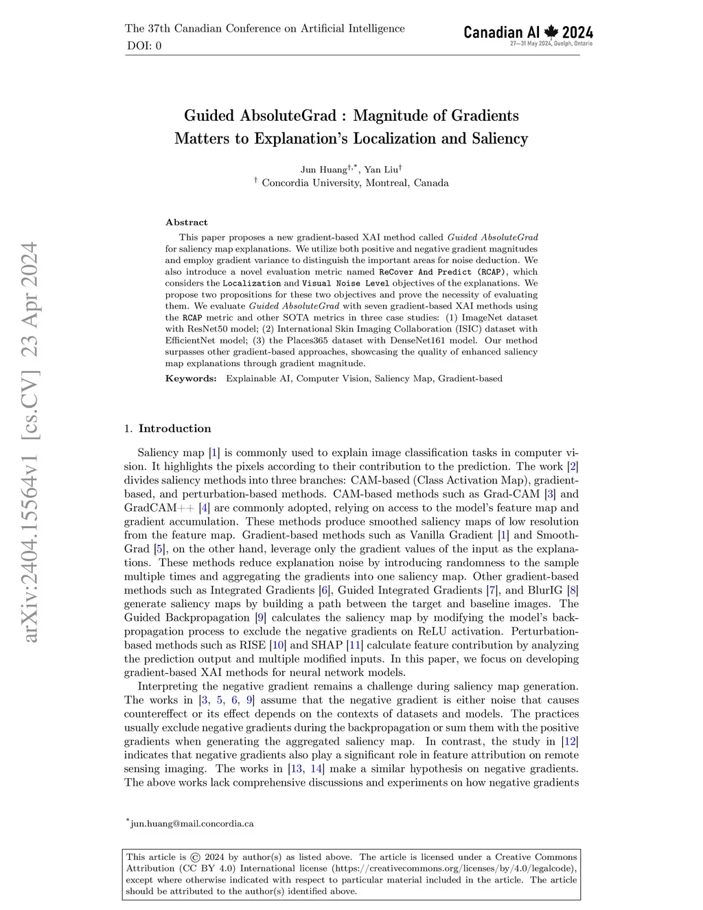 This paper proposes a new gradient-based XAI method called Guided AbsoluteGrad for saliency map explanations. We utilize both positive and negative gradient magnitudes and employ gradient variance to distinguish the important areas for noise deduction. We also introduce a novel evaluation metric named ReCover And Predict (RCAP), which considers the Localization and Visual Noise Level objectives of the explanations. We propose two propositions for these two objectives and prove the necessity of evaluating them. We evaluate Guided AbsoluteGrad with seven gradient-based XAI methods using the RCAP metric and other SOTA metrics in three case studies: (1) ImageNet dataset with ResNet50 model; (2) International Skin Imaging Collaboration (ISIC) dataset with EfficientNet model; (3) the Places365 dataset with DenseNet161 model. Our method surpasses other gradient-based approaches, showcasing the quality of enhanced saliency map explanations through gradient magnitude.