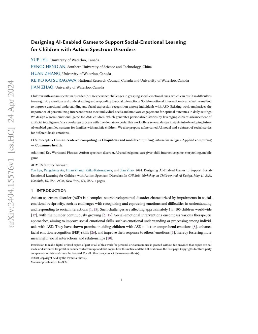 Children with autism spectrum disorder (ASD) experience challenges in grasping social-emotional cues, which can result in difficulties in recognizing emotions and understanding and responding to social interactions. Social-emotional intervention is an effective method to improve emotional understanding and facial expression recognition among individuals with ASD. Existing work emphasizes the importance of personalizing interventions to meet individual needs and motivate engagement for optimal outcomes in daily settings. We design a social-emotional game for ASD children, which generates personalized stories by leveraging the current advancement of artificial intelligence. Via a co-design process with five domain experts, this work offers several design insights into developing future AI-enabled gamified systems for families with autistic children. We also propose a fine-tuned AI model and a dataset of social stories for different basic emotions.