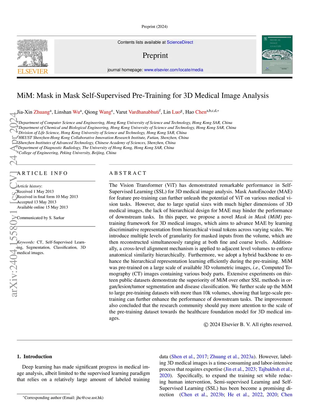 The Vision Transformer (ViT) has demonstrated remarkable performance in Self-Supervised Learning (SSL) for 3D medical image analysis. Masked AutoEncoder (MAE) for feature pre-training can further unleash the potential of ViT on various medical vision tasks. However, due to large spatial sizes with much higher dimensions of 3D medical images, the lack of hierarchical design for MAE may hinder the performance of downstream tasks. In this paper, we propose a novel \textit{Mask in Mask (MiM)} pre-training framework for 3D medical images, which aims to advance MAE by learning discriminative representation from hierarchical visual tokens across varying scales. We introduce multiple levels of granularity for masked inputs from the volume, which are then reconstructed simultaneously ranging at both fine and coarse levels. Additionally, a cross-level alignment mechanism is applied to adjacent level volumes to enforce anatomical similarity hierarchically. Furthermore, we adopt a hybrid backbone to enhance the hierarchical representation learning efficiently during the pre-training. MiM was pre-trained on a large scale of available 3D volumetric images, \textit{i.e.,} Computed Tomography (CT) images containing various body parts. Extensive experiments on thirteen public datasets demonstrate the superiority of MiM over other SSL methods in organ/lesion/tumor segmentation and disease classification. We further scale up the MiM to large pre-training datasets with more than 10k volumes, showing that large-scale pre-training can further enhance the performance of downstream tasks. The improvement also concluded that the research community should pay more attention to the scale of the pre-training dataset towards the healthcare foundation model for 3D medical images.