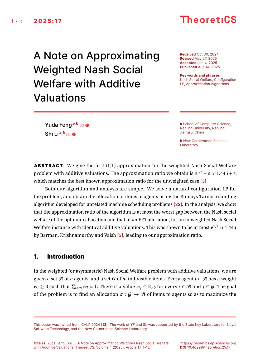 We give the first -approximation for the weighted Nash Social Welfare problem with additive valuations. The approximation ratio we obtain is , which matches the best known approximation ratio for the unweighted case.Both our algorithm and analysis are simple. We solve a natural configuration LP for the problem, and obtain the allocation of items to agents using a randomized version of the Shmoys-Tardos rounding algorithm developed for unrelated machine scheduling problems. In the analysis, we show that the approximation ratio of the algorithm is at most the worst gap between the Nash social welfare of the optimum allocation and that of an EF1 allocation, for an unweighted Nash Social Welfare instance with identical additive valuations. This was shown to be at most by Barman, Krishnamurthy and Vaish, leading to our approximation ratio.