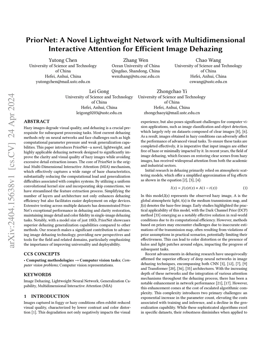 Hazy images degrade visual quality, and dehazing is a crucial prerequisite for subsequent processing tasks. Most current dehazing methods rely on neural networks and face challenges such as high computational parameter pressure and weak generalization capabilities. This paper introduces PriorNet--a novel, lightweight, and highly applicable dehazing network designed to significantly improve the clarity and visual quality of hazy images while avoiding excessive detail extraction issues. The core of PriorNet is the original Multi-Dimensional Interactive Attention (MIA) mechanism, which effectively captures a wide range of haze characteristics, substantially reducing the computational load and generalization difficulties associated with complex systems. By utilizing a uniform convolutional kernel size and incorporating skip connections, we have streamlined the feature extraction process. Simplifying the number of layers and architecture not only enhances dehazing efficiency but also facilitates easier deployment on edge devices. Extensive testing across multiple datasets has demonstrated PriorNet's exceptional performance in dehazing and clarity restoration, maintaining image detail and color fidelity in single-image dehazing tasks. Notably, with a model size of just 18Kb, PriorNet showcases superior dehazing generalization capabilities compared to other methods. Our research makes a significant contribution to advancing image dehazing technology, providing new perspectives and tools for the field and related domains, particularly emphasizing the importance of improving universality and deployability.