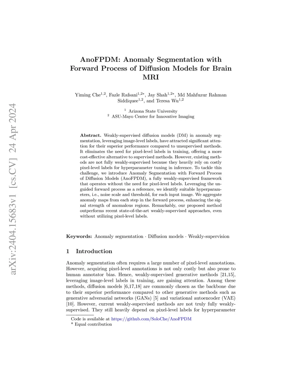 AnoFPDM: Anomaly Segmentation with Forward Process of Diffusion Models for Brain MRI