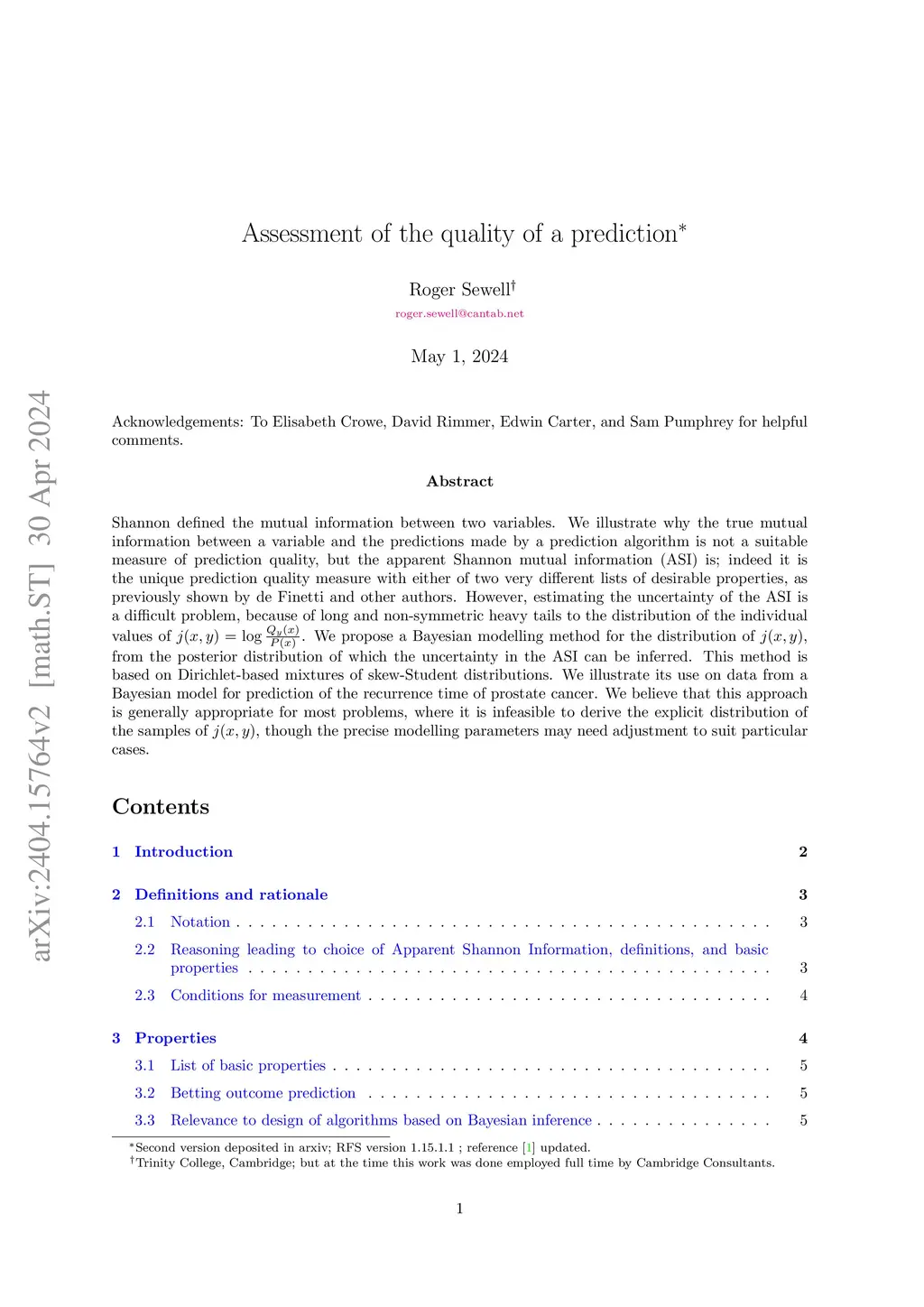 Shannon defined the mutual information between two variables. We illustrate why the true mutual information between a variable and the predictions made by a prediction algorithm is not a suitable measure of prediction quality, but the apparent Shannon mutual information (ASI) is; indeed it is the unique prediction quality measure with either of two very different lists of desirable properties, as previously shown by de Finetti and other authors. However, estimating the uncertainty of the ASI is a difficult problem, because of long and non-symmetric heavy tails to the distribution of the individual values of We propose a Bayesian modelling method for the distribution of , from the posterior distribution of which the uncertainty in the ASI can be inferred. This method is based on Dirichlet-based mixtures of skew-Student distributions. We illustrate its use on data from a Bayesian model for prediction of the recurrence time of prostate cancer. We believe that this approach is generally appropriate for most problems, where it is infeasible to derive the explicit distribution of the samples of , though the precise modelling parameters may need adjustment to suit particular cases.