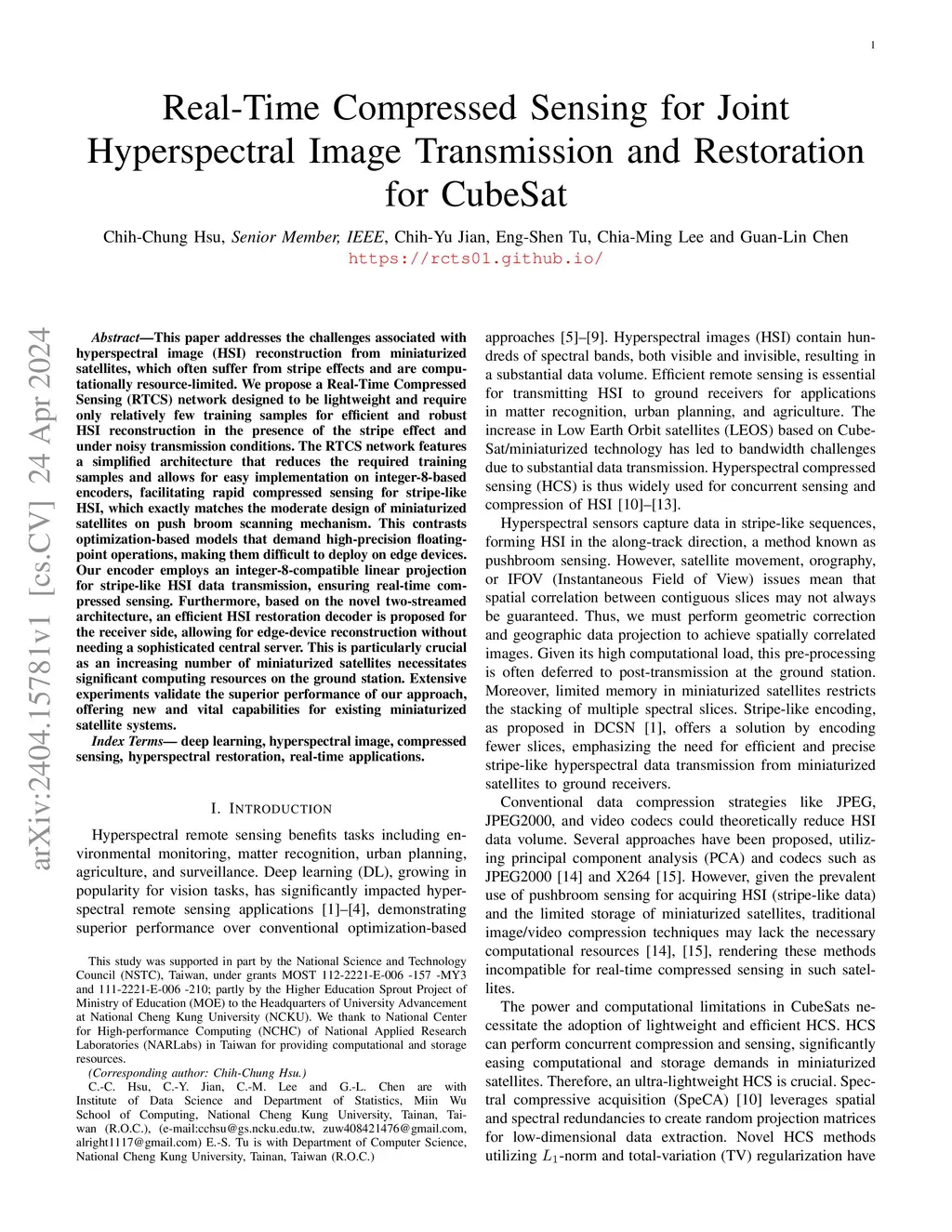 This paper addresses the challenges associated with hyperspectral image (HSI) reconstruction from miniaturized satellites, which often suffer from stripe effects and are computationally resource-limited. We propose a Real-Time Compressed Sensing (RTCS) network designed to be lightweight and require only relatively few training samples for efficient and robust HSI reconstruction in the presence of the stripe effect and under noisy transmission conditions. The RTCS network features a simplified architecture that reduces the required training samples and allows for easy implementation on integer-8-based encoders, facilitating rapid compressed sensing for stripe-like HSI, which exactly matches the moderate design of miniaturized satellites on push broom scanning mechanism. This contrasts optimization-based models that demand high-precision floating-point operations, making them difficult to deploy on edge devices. Our encoder employs an integer-8-compatible linear projection for stripe-like HSI data transmission, ensuring real-time compressed sensing. Furthermore, based on the novel two-streamed architecture, an efficient HSI restoration decoder is proposed for the receiver side, allowing for edge-device reconstruction without needing a sophisticated central server. This is particularly crucial as an increasing number of miniaturized satellites necessitates significant computing resources on the ground station. Extensive experiments validate the superior performance of our approach, offering new and vital capabilities for existing miniaturized satellite systems.