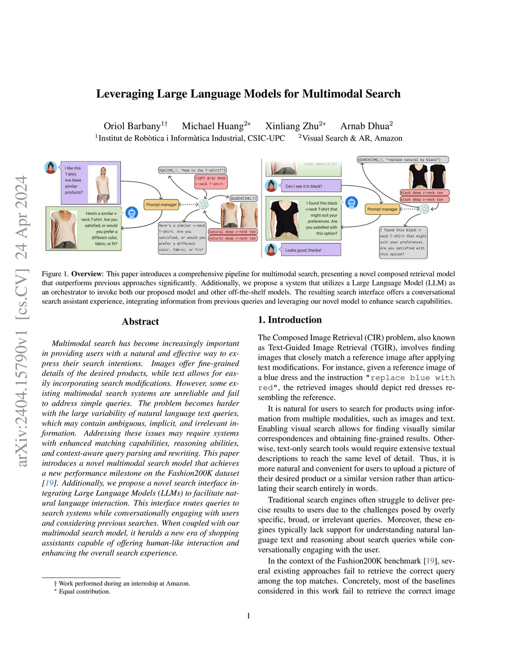 Multimodal search has become increasingly important in providing users with a natural and effective way to ex-press their search intentions. Images offer fine-grained details of the desired products, while text allows for easily incorporating search modifications. However, some existing multimodal search systems are unreliable and fail to address simple queries. The problem becomes harder with the large variability of natural language text queries, which may contain ambiguous, implicit, and irrelevant in-formation. Addressing these issues may require systems with enhanced matching capabilities, reasoning abilities, and context-aware query parsing and rewriting. This paper introduces a novel multimodal search model that achieves a new performance milestone on the Fashion200K dataset. Additionally, we propose a novel search interface integrating Large Language Models (LLMs) to facilitate natural language interaction. This interface routes queries to search systems while conversationally engaging with users and considering previous searches. When coupled with our multimodal search model, it heralds a new era of shopping assistants capable of offering human-like interaction and enhancing the overall search experience.