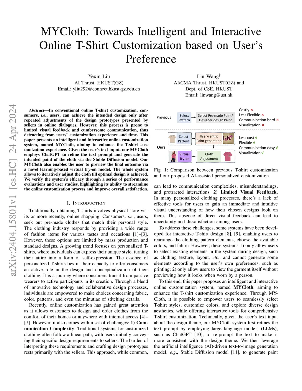 In conventional online T-shirt customization, consumers, \ie, users, can achieve the intended design only after repeated adjustments of the design prototypes presented by sellers in online dialogues. However, this process is prone to limited visual feedback and cumbersome communication, thus detracting from users' customization experience and time. This paper presents an intelligent and interactive online customization system, named \textbf{MYCloth}, aiming to enhance the T-shirt customization experience. Given the user's text input, our MYCloth employs ChatGPT to refine the text prompt and generate the intended paint of the cloth via the Stable Diffusion model. Our MYCloth also enables the user to preview the final outcome via a novel learning-based virtual try-on model. The whole system allows to iteratively adjust the cloth till optimal design is achieved. We verify the system's efficacy through a series of performance evaluations and user studies, highlighting its ability to streamline the online customization process and improve overall satisfaction.
