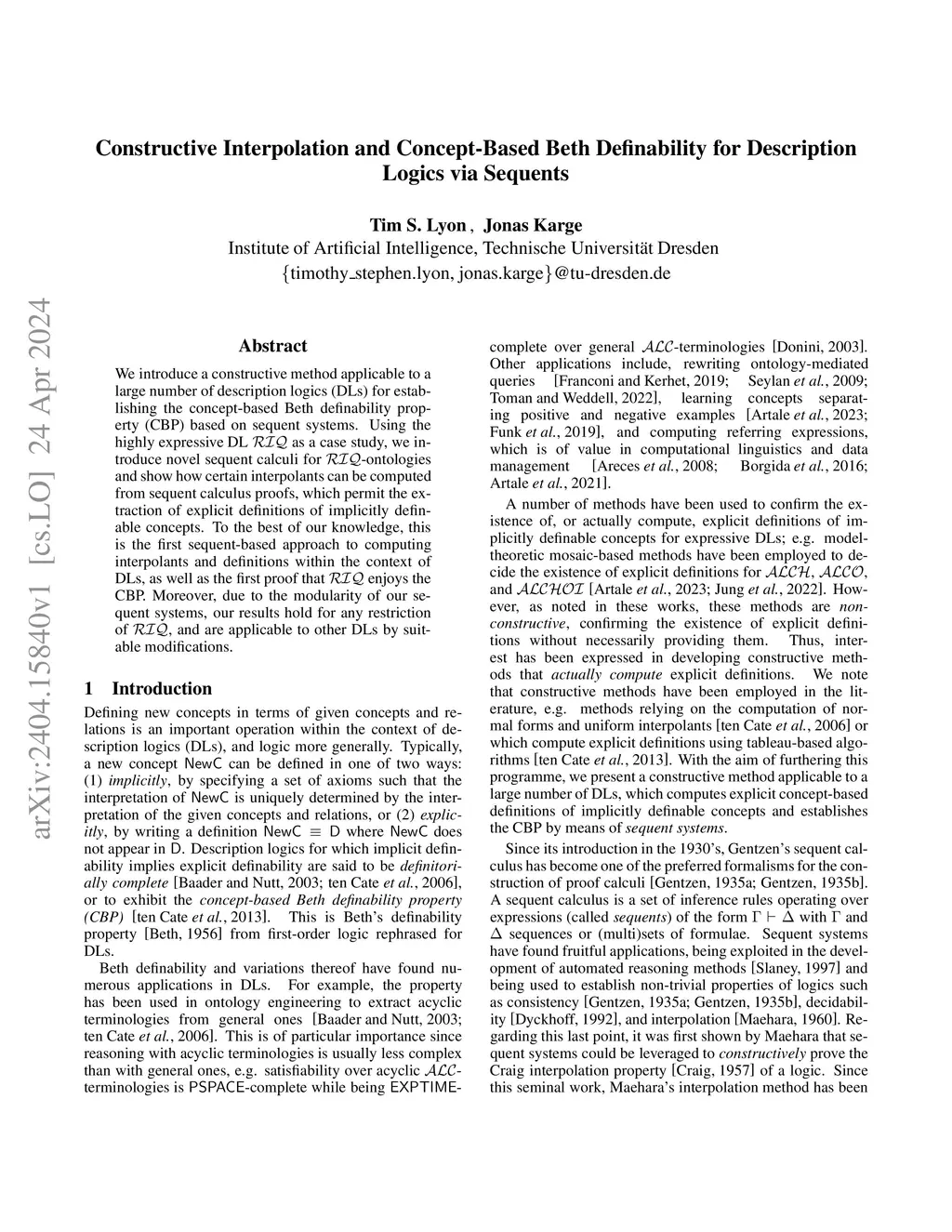 We introduce a constructive method applicable to a large number of description logics (DLs) for establishing the concept-based Beth definability property (CBP) based on sequent systems. Using the highly expressive DL RIQ as a case study, we introduce novel sequent calculi for RIQ-ontologies and show how certain interpolants can be computed from sequent calculus proofs, which permit the extraction of explicit definitions of implicitly definable concepts. To the best of our knowledge, this is the first sequent-based approach to computing interpolants and definitions within the context of DLs, as well as the first proof that RIQ enjoys the CBP. Moreover, due to the modularity of our sequent systems, our results hold for any restriction of RIQ, and are applicable to other DLs by suitable modifications.