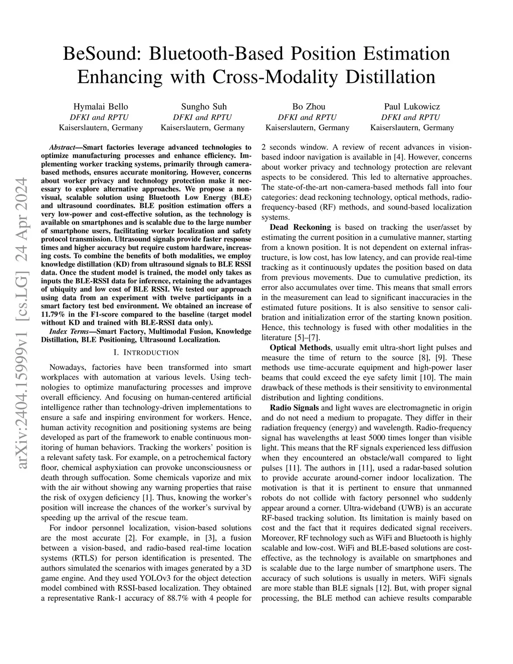 Smart factories leverage advanced technologies to optimize manufacturing processes and enhance efficiency. Implementing worker tracking systems, primarily through camera-based methods, ensures accurate monitoring. However, concerns about worker privacy and technology protection make it necessary to explore alternative approaches. We propose a non-visual, scalable solution using Bluetooth Low Energy (BLE) and ultrasound coordinates. BLE position estimation offers a very low-power and cost-effective solution, as the technology is available on smartphones and is scalable due to the large number of smartphone users, facilitating worker localization and safety protocol transmission. Ultrasound signals provide faster response times and higher accuracy but require custom hardware, increasing costs. To combine the benefits of both modalities, we employ knowledge distillation (KD) from ultrasound signals to BLE RSSI data. Once the student model is trained, the model only takes as inputs the BLE-RSSI data for inference, retaining the advantages of ubiquity and low cost of BLE RSSI. We tested our approach using data from an experiment with twelve participants in a smart factory test bed environment. We obtained an increase of 11.79% in the F1-score compared to the baseline (target model without KD and trained with BLE-RSSI data only).