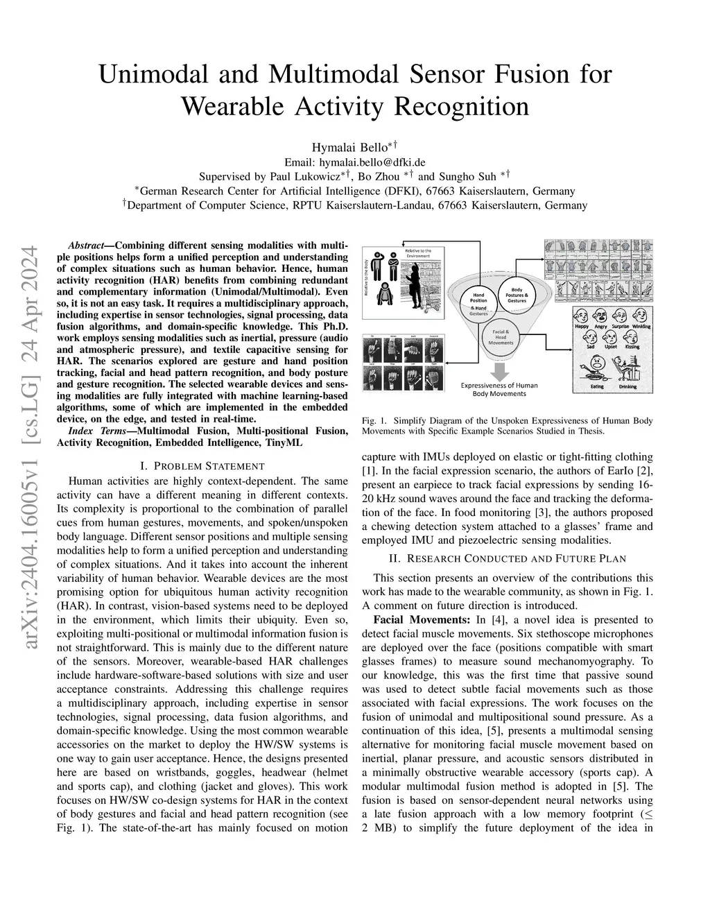Combining different sensing modalities with multiple positions helps form a unified perception and understanding of complex situations such as human behavior. Hence, human activity recognition (HAR) benefits from combining redundant and complementary information (Unimodal/Multimodal). Even so, it is not an easy task. It requires a multidisciplinary approach, including expertise in sensor technologies, signal processing, data fusion algorithms, and domain-specific knowledge. This Ph.D. work employs sensing modalities such as inertial, pressure (audio and atmospheric pressure), and textile capacitive sensing for HAR. The scenarios explored are gesture and hand position tracking, facial and head pattern recognition, and body posture and gesture recognition. The selected wearable devices and sensing modalities are fully integrated with machine learning-based algorithms, some of which are implemented in the embedded device, on the edge, and tested in real-time.