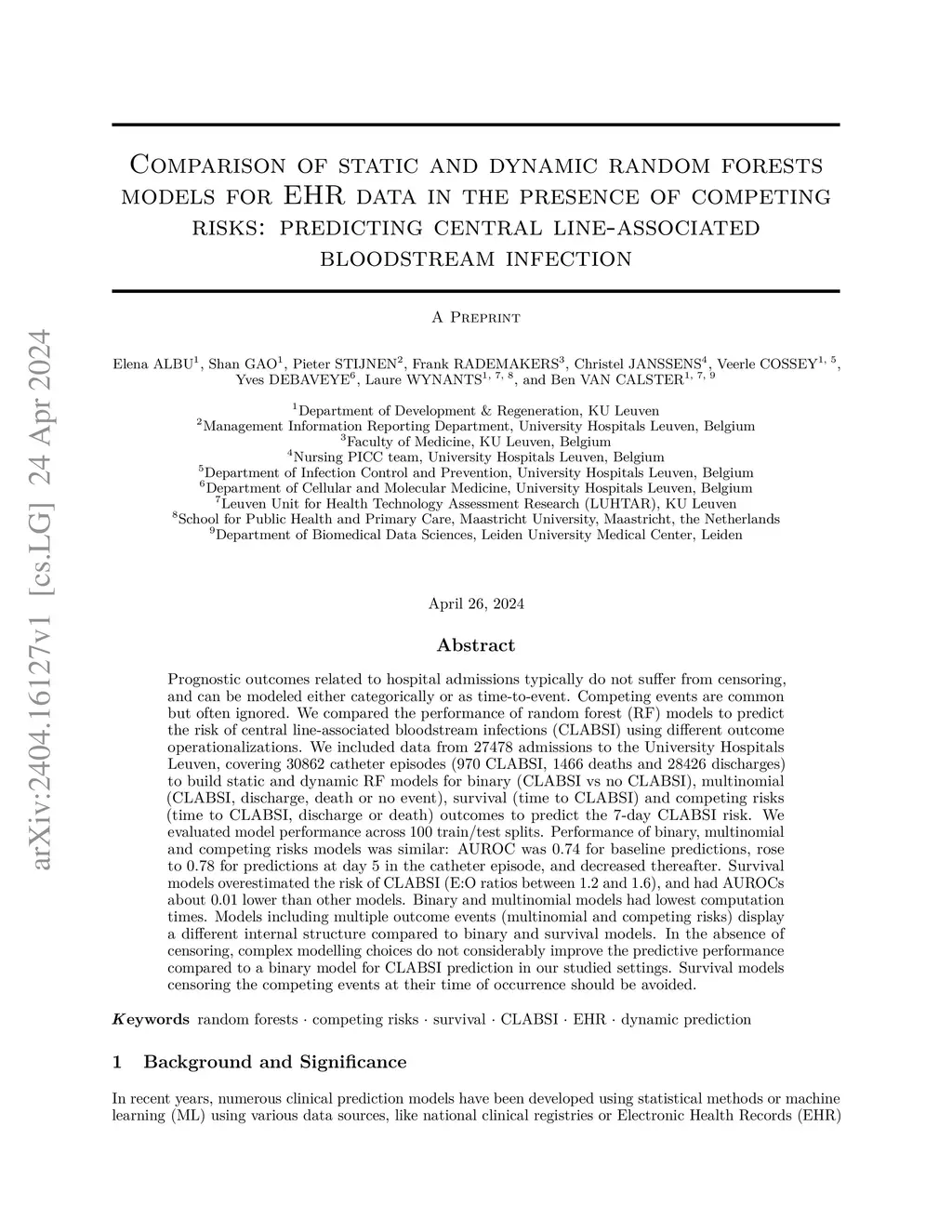 Prognostic outcomes related to hospital admissions typically do not suffer from censoring, and can be modeled either categorically or as time-to-event. Competing events are common but often ignored. We compared the performance of random forest (RF) models to predict the risk of central line-associated bloodstream infections (CLABSI) using different outcome operationalizations. We included data from 27478 admissions to the University Hospitals Leuven, covering 30862 catheter episodes (970 CLABSI, 1466 deaths and 28426 discharges) to build static and dynamic RF models for binary (CLABSI vs no CLABSI), multinomial (CLABSI, discharge, death or no event), survival (time to CLABSI) and competing risks (time to CLABSI, discharge or death) outcomes to predict the 7-day CLABSI risk. We evaluated model performance across 100 train/test splits. Performance of binary, multinomial and competing risks models was similar: AUROC was 0.74 for baseline predictions, rose to 0.78 for predictions at day 5 in the catheter episode, and decreased thereafter. Survival models overestimated the risk of CLABSI (E:O ratios between 1.2 and 1.6), and had AUROCs about 0.01 lower than other models. Binary and multinomial models had lowest computation times. Models including multiple outcome events (multinomial and competing risks) display a different internal structure compared to binary and survival models. In the absence of censoring, complex modelling choices do not considerably improve the predictive performance compared to a binary model for CLABSI prediction in our studied settings. Survival models censoring the competing events at their time of occurrence should be avoided.