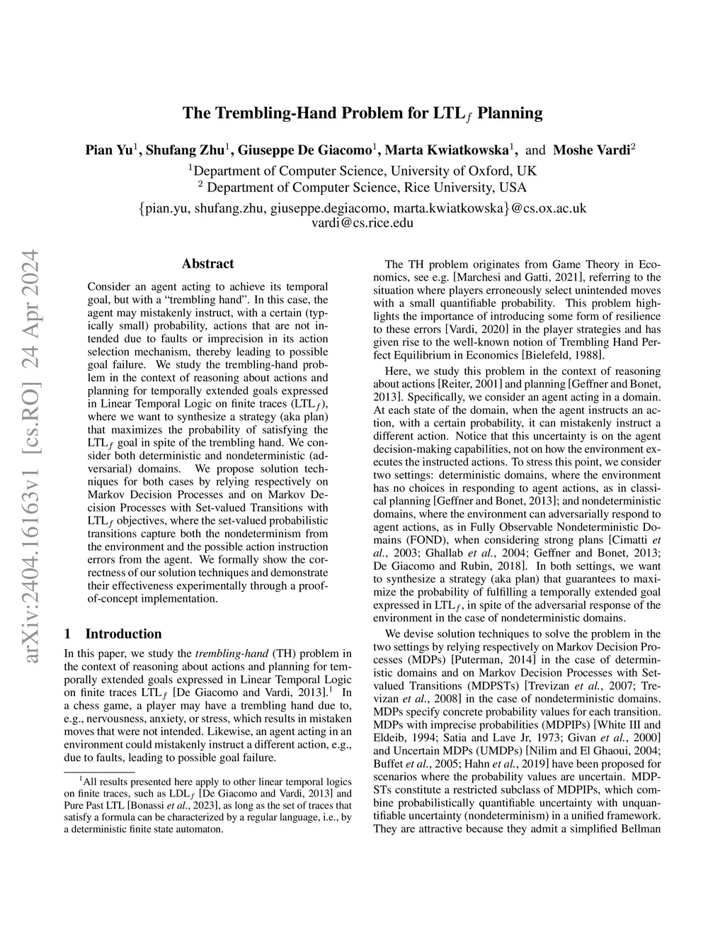 Consider an agent acting to achieve its temporal goal, but with a "trembling hand". In this case, the agent may mistakenly instruct, with a certain (typically small) probability, actions that are not intended due to faults or imprecision in its action selection mechanism, thereby leading to possible goal failure. We study the trembling-hand problem in the context of reasoning about actions and planning for temporally extended goals expressed in Linear Temporal Logic on finite traces (LTLf), where we want to synthesize a strategy (aka plan) that maximizes the probability of satisfying the LTLf goal in spite of the trembling hand. We consider both deterministic and nondeterministic (adversarial) domains. We propose solution techniques for both cases by relying respectively on Markov Decision Processes and on Markov Decision Processes with Set-valued Transitions with LTLf objectives, where the set-valued probabilistic transitions capture both the nondeterminism from the environment and the possible action instruction errors from the agent. We formally show the correctness of our solution techniques and demonstrate their effectiveness experimentally through a proof-of-concept implementation.