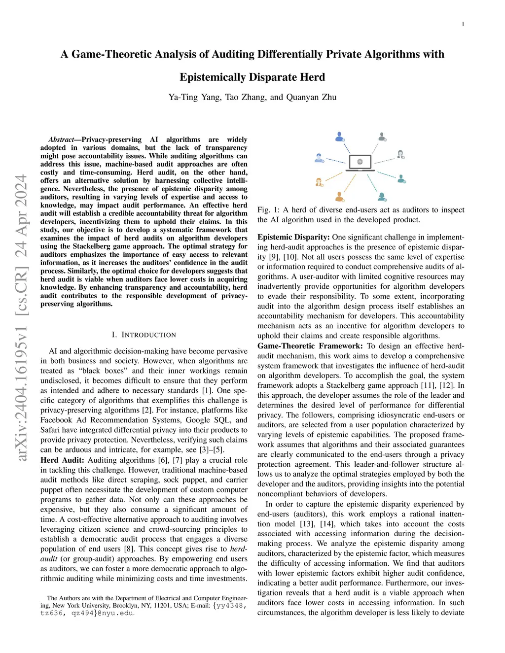 Privacy-preserving AI algorithms are widely adopted in various domains, but the lack of transparency might pose accountability issues. While auditing algorithms can address this issue, machine-based audit approaches are often costly and time-consuming. Herd audit, on the other hand, offers an alternative solution by harnessing collective intelligence. Nevertheless, the presence of epistemic disparity among auditors, resulting in varying levels of expertise and access to knowledge, may impact audit performance. An effective herd audit will establish a credible accountability threat for algorithm developers, incentivizing them to uphold their claims. In this study, our objective is to develop a systematic framework that examines the impact of herd audits on algorithm developers using the Stackelberg game approach. The optimal strategy for auditors emphasizes the importance of easy access to relevant information, as it increases the auditors' confidence in the audit process. Similarly, the optimal choice for developers suggests that herd audit is viable when auditors face lower costs in acquiring knowledge. By enhancing transparency and accountability, herd audit contributes to the responsible development of privacy-preserving algorithms.