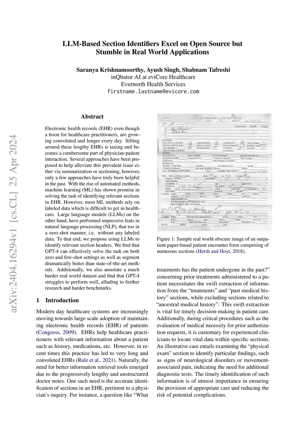 Electronic health records (EHR) even though a boon for healthcare practitioners, are growing convoluted and longer every day. Sifting around these lengthy EHRs is taxing and becomes a cumbersome part of physician-patient interaction. Several approaches have been proposed to help alleviate this prevalent issue either via summarization or sectioning, however, only a few approaches have truly been helpful in the past. With the rise of automated methods, machine learning (ML) has shown promise in solving the task of identifying relevant sections in EHR. However, most ML methods rely on labeled data which is difficult to get in healthcare. Large language models (LLMs) on the other hand, have performed impressive feats in natural language processing (NLP), that too in a zero-shot manner, i.e. without any labeled data. To that end, we propose using LLMs to identify relevant section headers. We find that GPT-4 can effectively solve the task on both zero and few-shot settings as well as segment dramatically better than state-of-the-art methods. Additionally, we also annotate a much harder real world dataset and find that GPT-4 struggles to perform well, alluding to further research and harder benchmarks.