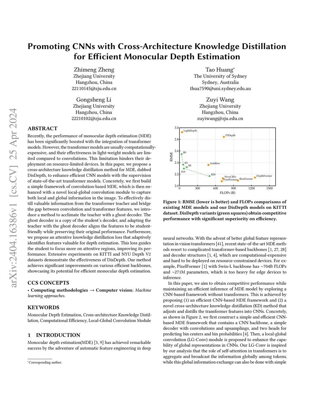 Recently, the performance of monocular depth estimation (MDE) has been significantly boosted with the integration of transformer models. However, the transformer models are usually computationally-expensive, and their effectiveness in light-weight models are limited compared to convolutions. This limitation hinders their deployment on resource-limited devices. In this paper, we propose a cross-architecture knowledge distillation method for MDE, dubbed DisDepth, to enhance efficient CNN models with the supervision of state-of-the-art transformer models. Concretely, we first build a simple framework of convolution-based MDE, which is then enhanced with a novel local-global convolution module to capture both local and global information in the image. To effectively distill valuable information from the transformer teacher and bridge the gap between convolution and transformer features, we introduce a method to acclimate the teacher with a ghost decoder. The ghost decoder is a copy of the student's decoder, and adapting the teacher with the ghost decoder aligns the features to be student-friendly while preserving their original performance. Furthermore, we propose an attentive knowledge distillation loss that adaptively identifies features valuable for depth estimation. This loss guides the student to focus more on attentive regions, improving its performance. Extensive experiments on KITTI and NYU Depth V2 datasets demonstrate the effectiveness of DisDepth. Our method achieves significant improvements on various efficient backbones, showcasing its potential for efficient monocular depth estimation.