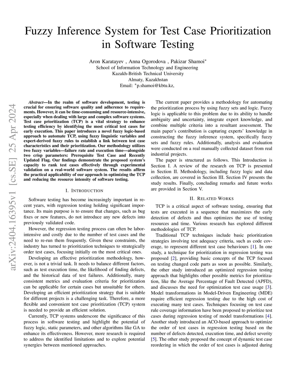 In the realm of software development, testing is crucial for ensuring software quality and adherence to requirements. However, it can be time-consuming and resource-intensive, especially when dealing with large and complex software systems. Test case prioritization (TCP) is a vital strategy to enhance testing efficiency by identifying the most critical test cases for early execution. This paper introduces a novel fuzzy logic-based approach to automate TCP, using fuzzy linguistic variables and expert-derived fuzzy rules to establish a link between test case characteristics and their prioritization. Our methodology utilizes two fuzzy variables - failure rate and execution time - alongside two crisp parameters: Prerequisite Test Case and Recently Updated Flag. Our findings demonstrate the proposed system capacity to rank test cases effectively through experimental validation on a real-world software system. The results affirm the practical applicability of our approach in optimizing the TCP and reducing the resource intensity of software testing.