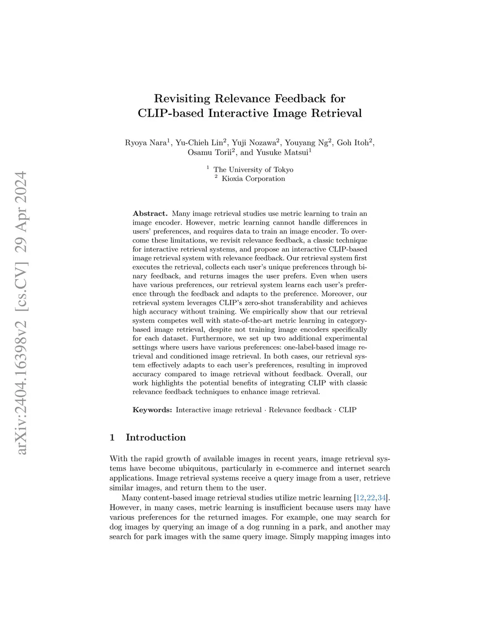 Many image retrieval studies use metric learning to train an image encoder. However, metric learning cannot handle differences in users' preferences, and requires data to train an image encoder. To overcome these limitations, we revisit relevance feedback, a classic technique for interactive retrieval systems, and propose an interactive CLIP-based image retrieval system with relevance feedback. Our retrieval system first executes the retrieval, collects each user's unique preferences through binary feedback, and returns images the user prefers. Even when users have various preferences, our retrieval system learns each user's preference through the feedback and adapts to the preference. Moreover, our retrieval system leverages CLIP's zero-shot transferability and achieves high accuracy without training. We empirically show that our retrieval system competes well with state-of-the-art metric learning in category-based image retrieval, despite not training image encoders specifically for each dataset. Furthermore, we set up two additional experimental settings where users have various preferences: one-label-based image retrieval and conditioned image retrieval. In both cases, our retrieval system effectively adapts to each user's preferences, resulting in improved accuracy compared to image retrieval without feedback. Overall, our work highlights the potential benefits of integrating CLIP with classic relevance feedback techniques to enhance image retrieval.