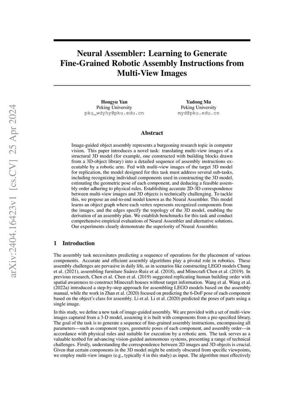 Image-guided object assembly represents a burgeoning research topic in computer vision. This paper introduces a novel task: translating multi-view images of a structural 3D model (for example, one constructed with building blocks drawn from a 3D-object library) into a detailed sequence of assembly instructions executable by a robotic arm. Fed with multi-view images of the target 3D model for replication, the model designed for this task must address several sub-tasks, including recognizing individual components used in constructing the 3D model, estimating the geometric pose of each component, and deducing a feasible assembly order adhering to physical rules. Establishing accurate 2D-3D correspondence between multi-view images and 3D objects is technically challenging. To tackle this, we propose an end-to-end model known as the Neural Assembler. This model learns an object graph where each vertex represents recognized components from the images, and the edges specify the topology of the 3D model, enabling the derivation of an assembly plan. We establish benchmarks for this task and conduct comprehensive empirical evaluations of Neural Assembler and alternative solutions. Our experiments clearly demonstrate the superiority of Neural Assembler.