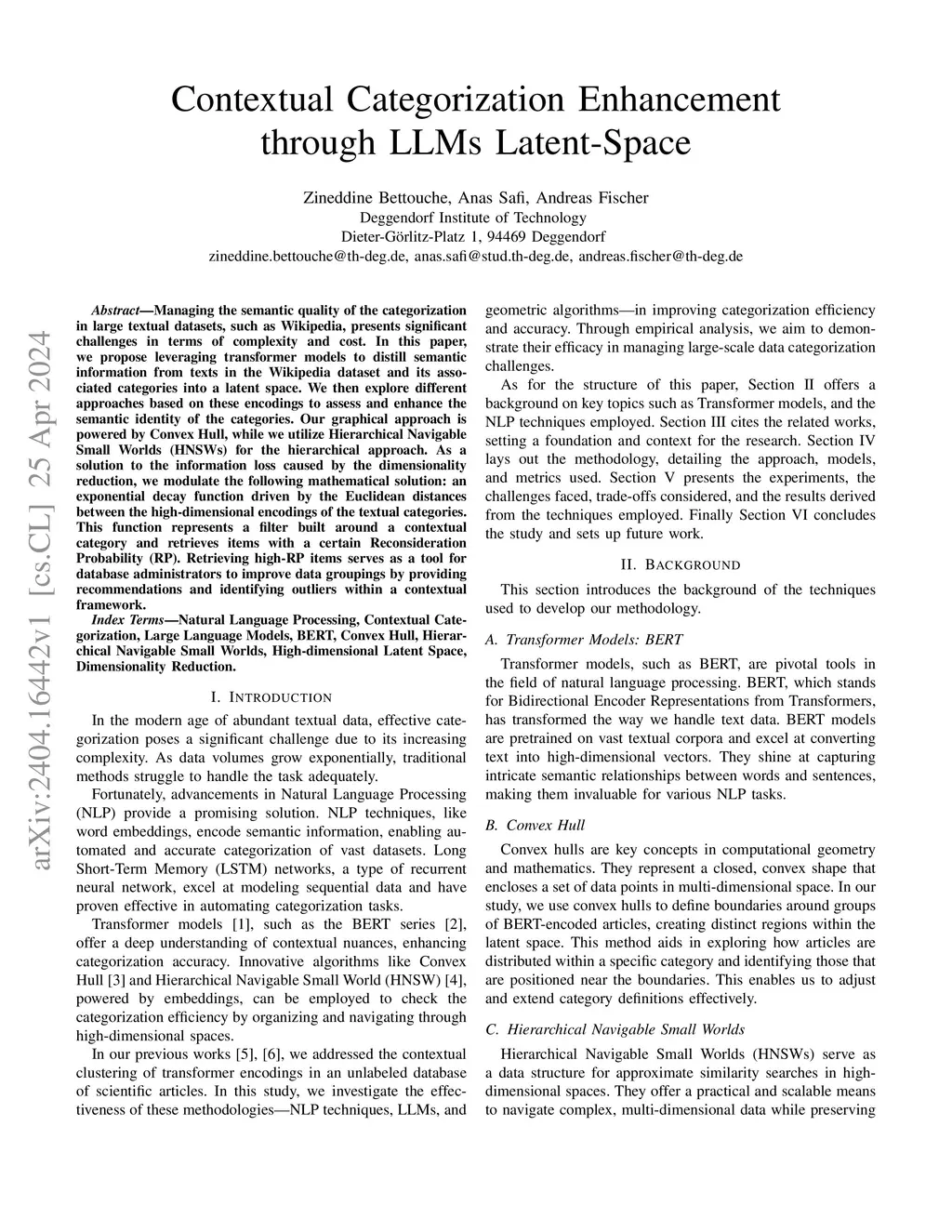Managing the semantic quality of the categorization in large textual datasets, such as Wikipedia, presents significant challenges in terms of complexity and cost. In this paper, we propose leveraging transformer models to distill semantic information from texts in the Wikipedia dataset and its associated categories into a latent space. We then explore different approaches based on these encodings to assess and enhance the semantic identity of the categories. Our graphical approach is powered by Convex Hull, while we utilize Hierarchical Navigable Small Worlds (HNSWs) for the hierarchical approach. As a solution to the information loss caused by the dimensionality reduction, we modulate the following mathematical solution: an exponential decay function driven by the Euclidean distances between the high-dimensional encodings of the textual categories. This function represents a filter built around a contextual category and retrieves items with a certain Reconsideration Probability (RP). Retrieving high-RP items serves as a tool for database administrators to improve data groupings by providing recommendations and identifying outliers within a contextual framework.