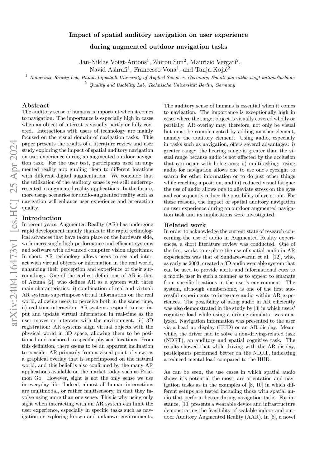The auditory sense of humans is important when it comes to navigation. The importance is especially high in cases when an object of interest is visually partly or fully covered. Interactions with users of technology are mainly focused on the visual domain of navigation tasks. This paper presents the results of a literature review and user study exploring the impact of spatial auditory navigation on user experience during an augmented outdoor navigation task. For the user test, participants used an augmented reality app guiding them to different locations with different digital augmentation. We conclude that the utilization of the auditory sense is yet still underrepresented in augmented reality applications. In the future, more usage scenarios for audio-augmented reality such as navigation will enhance user experience and interaction quality.
