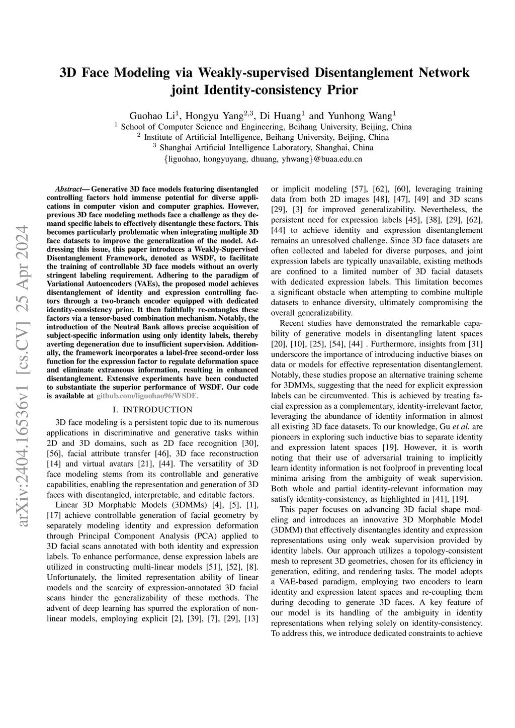 3D Face Modeling via Weakly-supervised Disentanglement Network joint