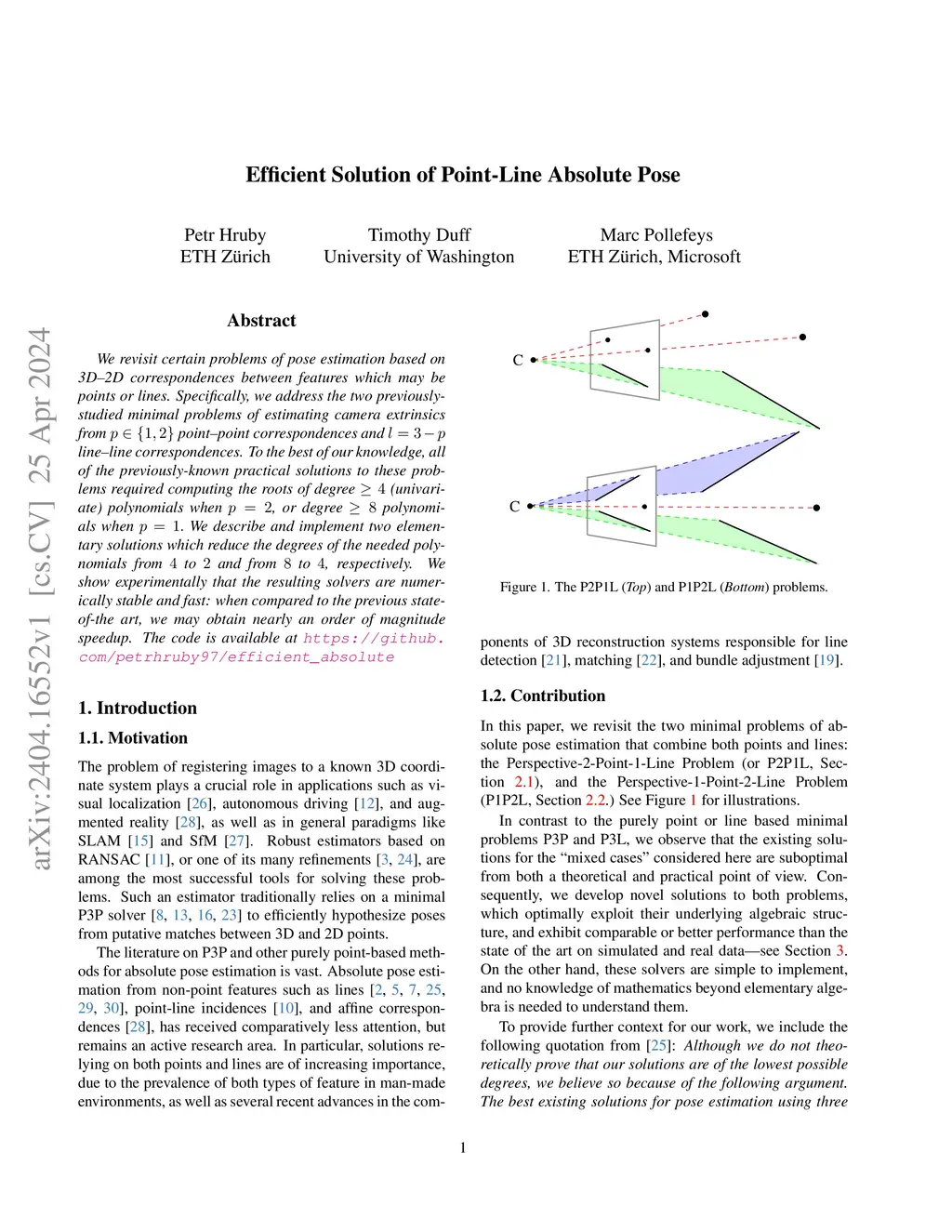 We revisit certain problems of pose estimation based on 3D--2D correspondences between features which may be points or lines. Specifically, we address the two previously-studied minimal problems of estimating camera extrinsics from point--point correspondences and line--line correspondences. To the best of our knowledge, all of the previously-known practical solutions to these problems required computing the roots of degree (univariate) polynomials when , or degree polynomials when We describe and implement two elementary solutions which reduce the degrees of the needed polynomials from to and from to , respectively. We show experimentally that the resulting solvers are numerically stable and fast: when compared to the previous state-of-the art, we may obtain nearly an order of magnitude speedup. The code is available at \url{https://github.com/petrhruby97/efficient\_absolute}