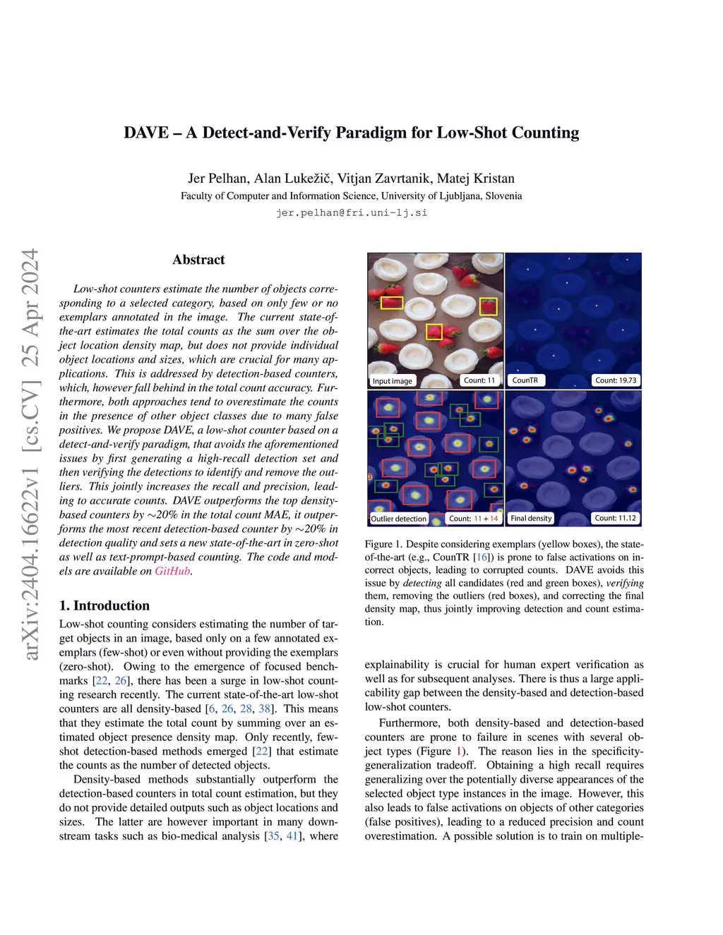 Low-shot counters estimate the number of objects corresponding to a selected category, based on only few or no exemplars annotated in the image. The current state-of-the-art estimates the total counts as the sum over the object location density map, but does not provide individual object locations and sizes, which are crucial for many applications. This is addressed by detection-based counters, which, however fall behind in the total count accuracy. Furthermore, both approaches tend to overestimate the counts in the presence of other object classes due to many false positives. We propose DAVE, a low-shot counter based on a detect-and-verify paradigm, that avoids the aforementioned issues by first generating a high-recall detection set and then verifying the detections to identify and remove the outliers. This jointly increases the recall and precision, leading to accurate counts. DAVE outperforms the top density-based counters by ~20% in the total count MAE, it outperforms the most recent detection-based counter by ~20% in detection quality and sets a new state-of-the-art in zero-shot as well as text-prompt-based counting.