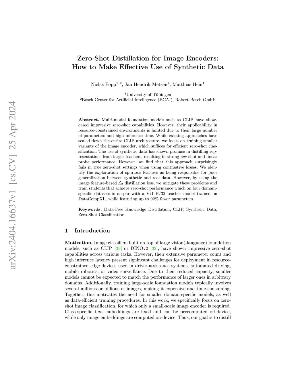 Multi-modal foundation models such as CLIP have showcased impressive zero-shot capabilities. However, their applicability in resource-constrained environments is limited due to their large number of parameters and high inference time. While existing approaches have scaled down the entire CLIP architecture, we focus on training smaller variants of the image encoder, which suffices for efficient zero-shot classification. The use of synthetic data has shown promise in distilling representations from larger teachers, resulting in strong few-shot and linear probe performance. However, we find that this approach surprisingly fails in true zero-shot settings when using contrastive losses. We identify the exploitation of spurious features as being responsible for poor generalization between synthetic and real data. However, by using the image feature-based L2 distillation loss, we mitigate these problems and train students that achieve zero-shot performance which on four domain-specific datasets is on-par with a ViT-B/32 teacher model trained on DataCompXL, while featuring up to 92% fewer parameters.