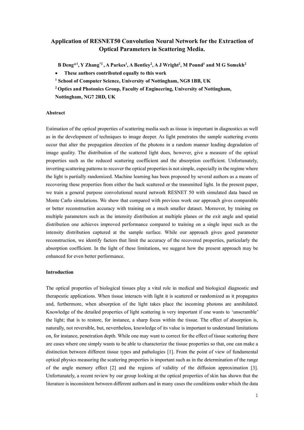 Application of RESNET50 Convolution Neural Network for the Extraction of Optical Parameters in Scattering Media