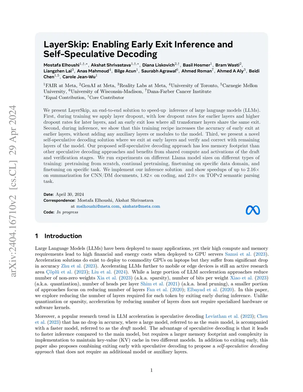 LayerSkip: Enabling Early Exit Inference and Self-Speculative Decoding