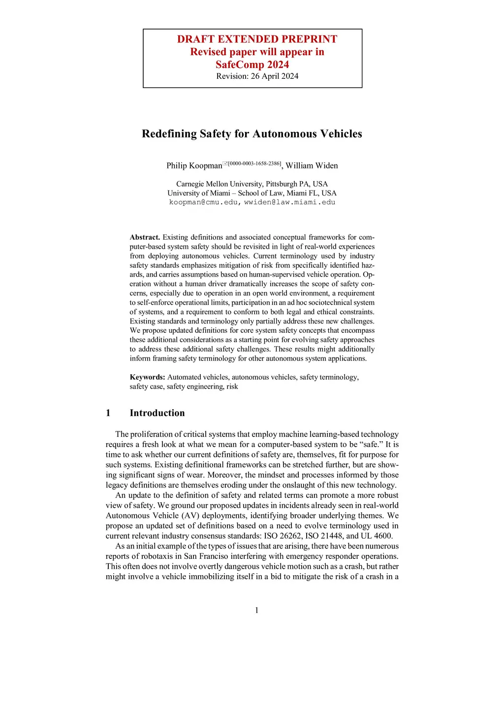 Existing definitions and associated conceptual frameworks for computer-based system safety should be revisited in light of real-world experiences from deploying autonomous vehicles. Current terminology used by industry safety standards emphasizes mitigation of risk from specifically identified hazards, and carries assumptions based on human-supervised vehicle operation. Operation without a human driver dramatically increases the scope of safety concerns, especially due to operation in an open world environment, a requirement to self-enforce operational limits, participation in an ad hoc sociotechnical system of systems, and a requirement to conform to both legal and ethical constraints. Existing standards and terminology only partially address these new challenges. We propose updated definitions for core system safety concepts that encompass these additional considerations as a starting point for evolving safe-ty approaches to address these additional safety challenges. These results might additionally inform framing safety terminology for other autonomous system applications.