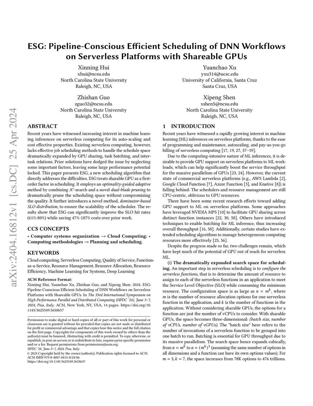 Recent years have witnessed increasing interest in machine learning inferences on serverless computing for its auto-scaling and cost effective properties. Existing serverless computing, however, lacks effective job scheduling methods to handle the schedule space dramatically expanded by GPU sharing, task batching, and inter-task relations. Prior solutions have dodged the issue by neglecting some important factors, leaving some large performance potential locked. This paper presents ESG, a new scheduling algorithm that directly addresses the difficulties. ESG treats sharable GPU as a first-order factor in scheduling. It employs an optimality-guided adaptive method by combining A*-search and a novel dual-blade pruning to dramatically prune the scheduling space without compromising the quality. It further introduces a novel method, dominator-based SLO distribution, to ensure the scalability of the scheduler. The results show that ESG can significantly improve the SLO hit rates 61%-80% while saving 47%-187% costs over prior work.