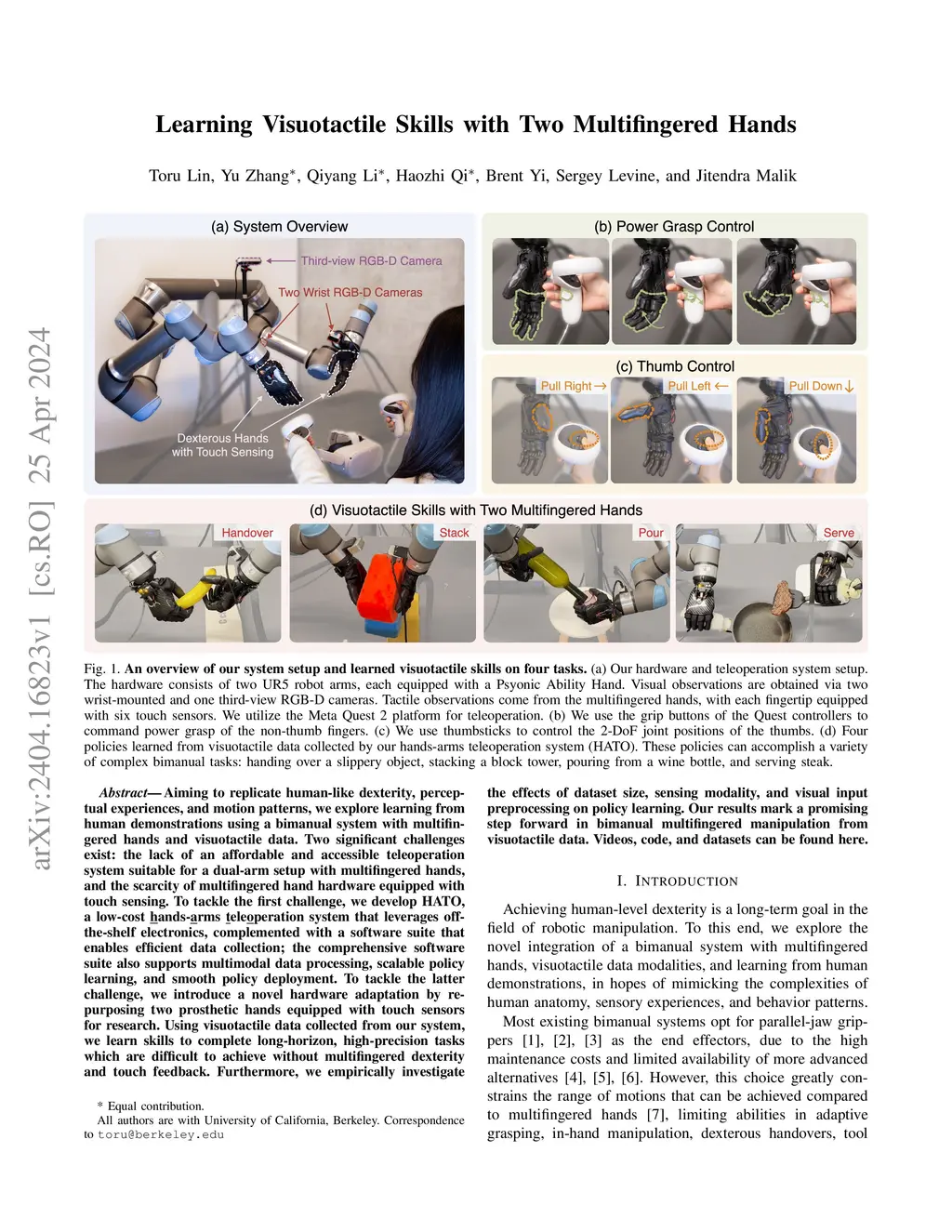 Aiming to replicate human-like dexterity, perceptual experiences, and motion patterns, we explore learning from human demonstrations using a bimanual system with multifingered hands and visuotactile data. Two significant challenges exist: the lack of an affordable and accessible teleoperation system suitable for a dual-arm setup with multifingered hands, and the scarcity of multifingered hand hardware equipped with touch sensing. To tackle the first challenge, we develop HATO, a low-cost hands-arms teleoperation system that leverages off-the-shelf electronics, complemented with a software suite that enables efficient data collection; the comprehensive software suite also supports multimodal data processing, scalable policy learning, and smooth policy deployment. To tackle the latter challenge, we introduce a novel hardware adaptation by repurposing two prosthetic hands equipped with touch sensors for research. Using visuotactile data collected from our system, we learn skills to complete long-horizon, high-precision tasks which are difficult to achieve without multifingered dexterity and touch feedback. Furthermore, we empirically investigate the effects of dataset size, sensing modality, and visual input preprocessing on policy learning. Our results mark a promising step forward in bimanual multifingered manipulation from visuotactile data. Videos, code, and datasets can be found at https://toruowo.github.io/hato/ .