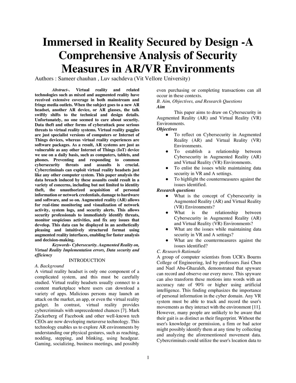 Immersed in Reality Secured by Design -- A Comprehensive Analysis of