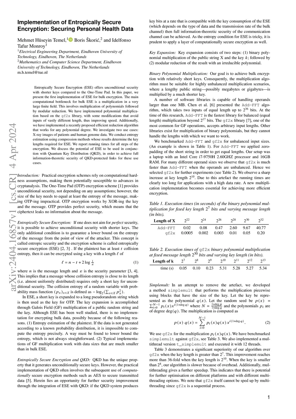Entropically Secure Encryption (ESE) offers unconditional security with shorter keys compared to the One-Time Pad. In this paper, we present the first implementation of ESE for bulk encryption. The main computational bottleneck for bulk ESE is a multiplication in a very large finite field. This involves multiplication of polynomials followed by modular reduction. We have implemented polynomial multiplication based on the gf2x library, with some modifications that avoid inputs of vastly different length, thus improving speed. Additionally, we have implemented a recently proposed efficient reduction algorithm that works for any polynomial degree. We investigate two use cases: X-ray images of patients and human genome data. We conduct entropy estimation using compression methods whose results determine the key lengths required for ESE. We report running times for all steps of the encryption. We discuss the potential of ESE to be used in conjunction with Quantum Key Distribution (QKD), in order to achieve full information-theoretic security of QKD-protected links for these use cases.