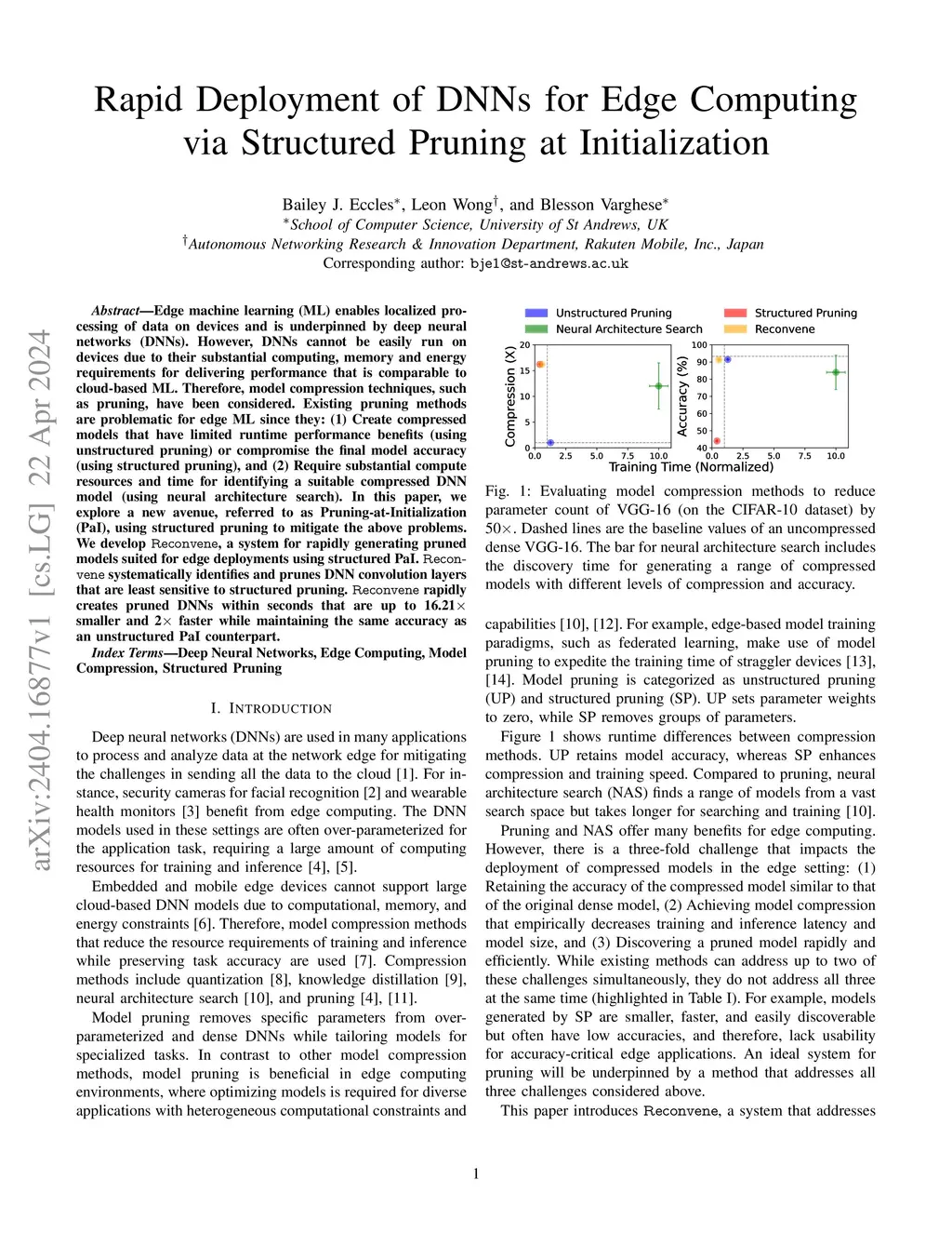 Edge machine learning (ML) enables localized processing of data on devices and is underpinned by deep neural networks (DNNs). However, DNNs cannot be easily run on devices due to their substantial computing, memory and energy requirements for delivering performance that is comparable to cloud-based ML. Therefore, model compression techniques, such as pruning, have been considered. Existing pruning methods are problematic for edge ML since they: (1) Create compressed models that have limited runtime performance benefits (using unstructured pruning) or compromise the final model accuracy (using structured pruning), and (2) Require substantial compute resources and time for identifying a suitable compressed DNN model (using neural architecture search). In this paper, we explore a new avenue, referred to as Pruning-at-Initialization (PaI), using structured pruning to mitigate the above problems. We develop Reconvene, a system for rapidly generating pruned models suited for edge deployments using structured PaI. Reconvene systematically identifies and prunes DNN convolution layers that are least sensitive to structured pruning. Reconvene rapidly creates pruned DNNs within seconds that are up to 16.21x smaller and 2x faster while maintaining the same accuracy as an unstructured PaI counterpart.