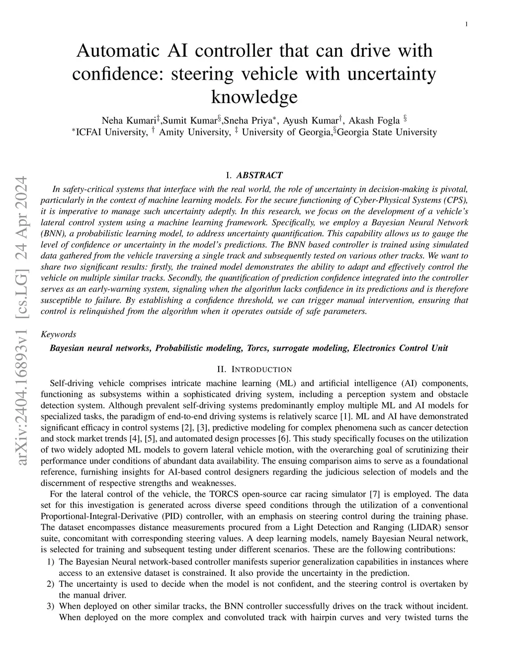In safety-critical systems that interface with the real world, the role of uncertainty in decision-making is pivotal, particularly in the context of machine learning models. For the secure functioning of Cyber-Physical Systems (CPS), it is imperative to manage such uncertainty adeptly. In this research, we focus on the development of a vehicle's lateral control system using a machine learning framework. Specifically, we employ a Bayesian Neural Network (BNN), a probabilistic learning model, to address uncertainty quantification. This capability allows us to gauge the level of confidence or uncertainty in the model's predictions. The BNN based controller is trained using simulated data gathered from the vehicle traversing a single track and subsequently tested on various other tracks. We want to share two significant results: firstly, the trained model demonstrates the ability to adapt and effectively control the vehicle on multiple similar tracks. Secondly, the quantification of prediction confidence integrated into the controller serves as an early-warning system, signaling when the algorithm lacks confidence in its predictions and is therefore susceptible to failure. By establishing a confidence threshold, we can trigger manual intervention, ensuring that control is relinquished from the algorithm when it operates outside of safe parameters.
