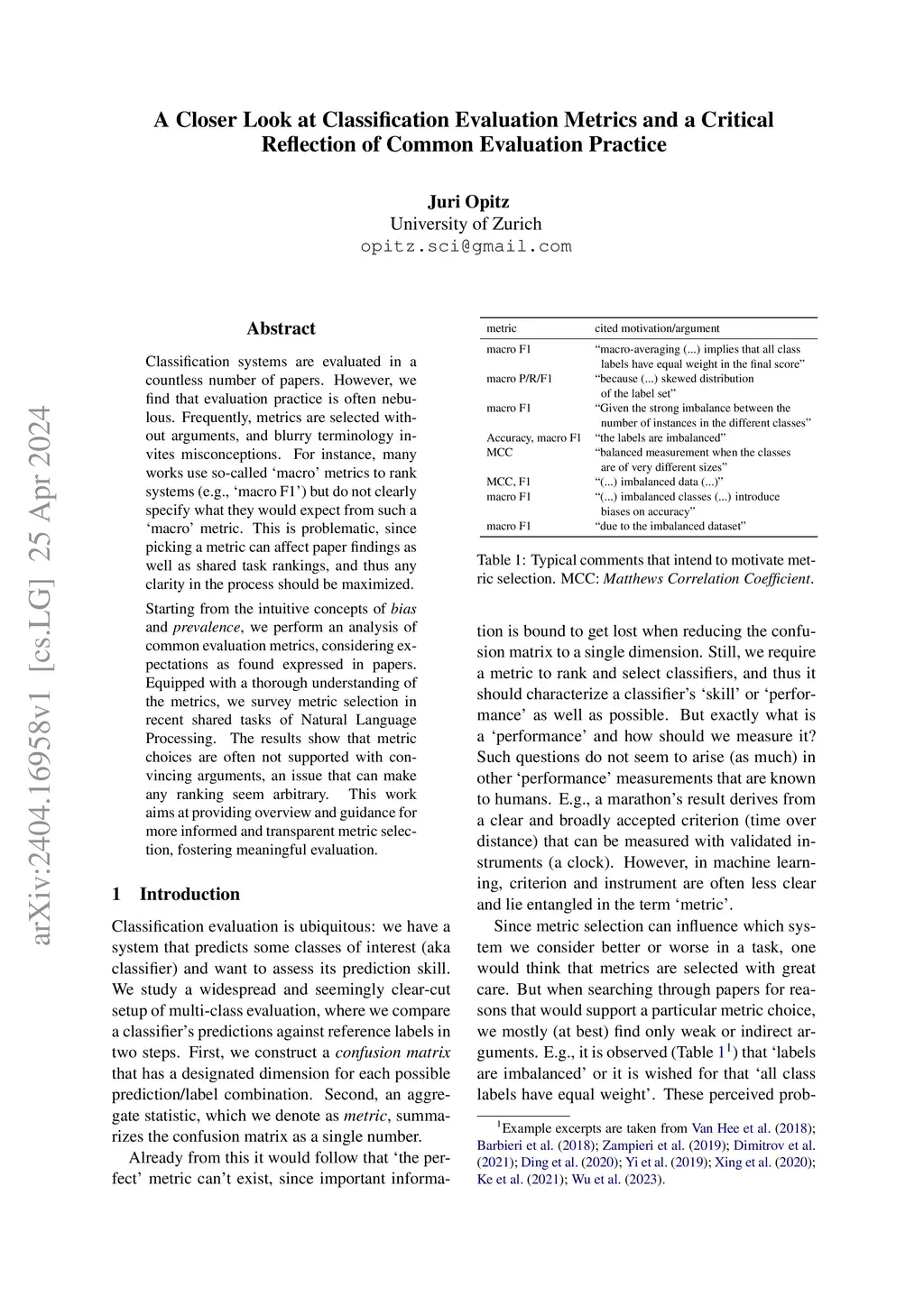 Classification systems are evaluated in a countless number of papers. However, we find that evaluation practice is often nebulous. Frequently, metrics are selected without arguments, and blurry terminology invites misconceptions. For instance, many works use so-called 'macro' metrics to rank systems (e.g., 'macro F1') but do not clearly specify what they would expect from such a `macro' metric. This is problematic, since picking a metric can affect research findings, and thus any clarity in the process should be maximized. Starting from the intuitive concepts of bias and prevalence, we perform an analysis of common evaluation metrics. The analysis helps us understand the metrics' underlying properties, and how they align with expectations as found expressed in papers. Then we reflect on the practical situation in the field, and survey evaluation practice in recent shared tasks. We find that metric selection is often not supported with convincing arguments, an issue that can make a system ranking seem arbitrary. Our work aims at providing overview and guidance for more informed and transparent metric selection, fostering meaningful evaluation.
