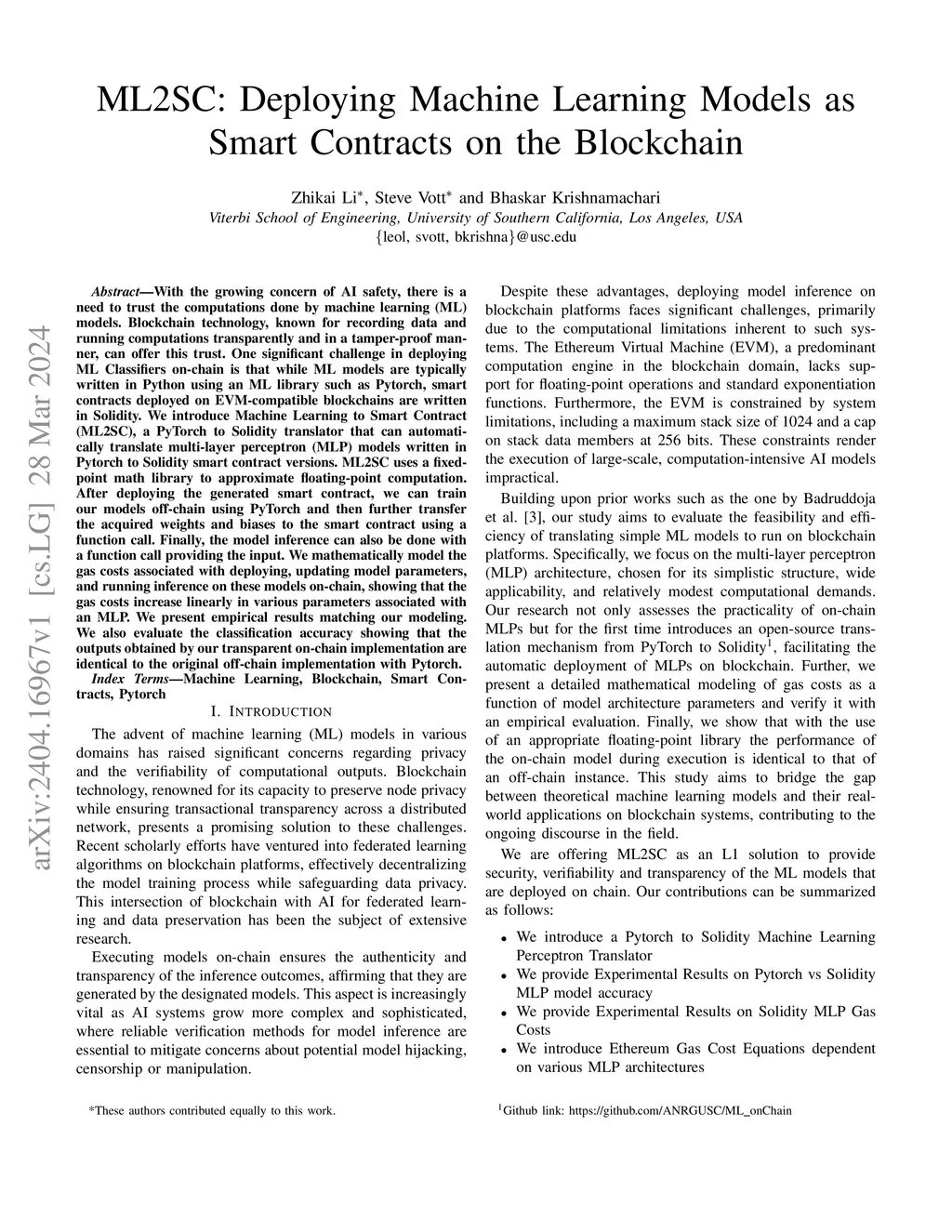 With the growing concern of AI safety, there is a need to trust the computations done by machine learning (ML) models. Blockchain technology, known for recording data and running computations transparently and in a tamper-proof manner, can offer this trust. One significant challenge in deploying ML Classifiers on-chain is that while ML models are typically written in Python using an ML library such as Pytorch, smart contracts deployed on EVM-compatible blockchains are written in Solidity. We introduce Machine Learning to Smart Contract (ML2SC), a PyTorch to Solidity translator that can automatically translate multi-layer perceptron (MLP) models written in Pytorch to Solidity smart contract versions. ML2SC uses a fixed-point math library to approximate floating-point computation. After deploying the generated smart contract, we can train our models off-chain using PyTorch and then further transfer the acquired weights and biases to the smart contract using a function call. Finally, the model inference can also be done with a function call providing the input. We mathematically model the gas costs associated with deploying, updating model parameters, and running inference on these models on-chain, showing that the gas costs increase linearly in various parameters associated with an MLP. We present empirical results matching our modeling. We also evaluate the classification accuracy showing that the outputs obtained by our transparent on-chain implementation are identical to the original off-chain implementation with Pytorch.