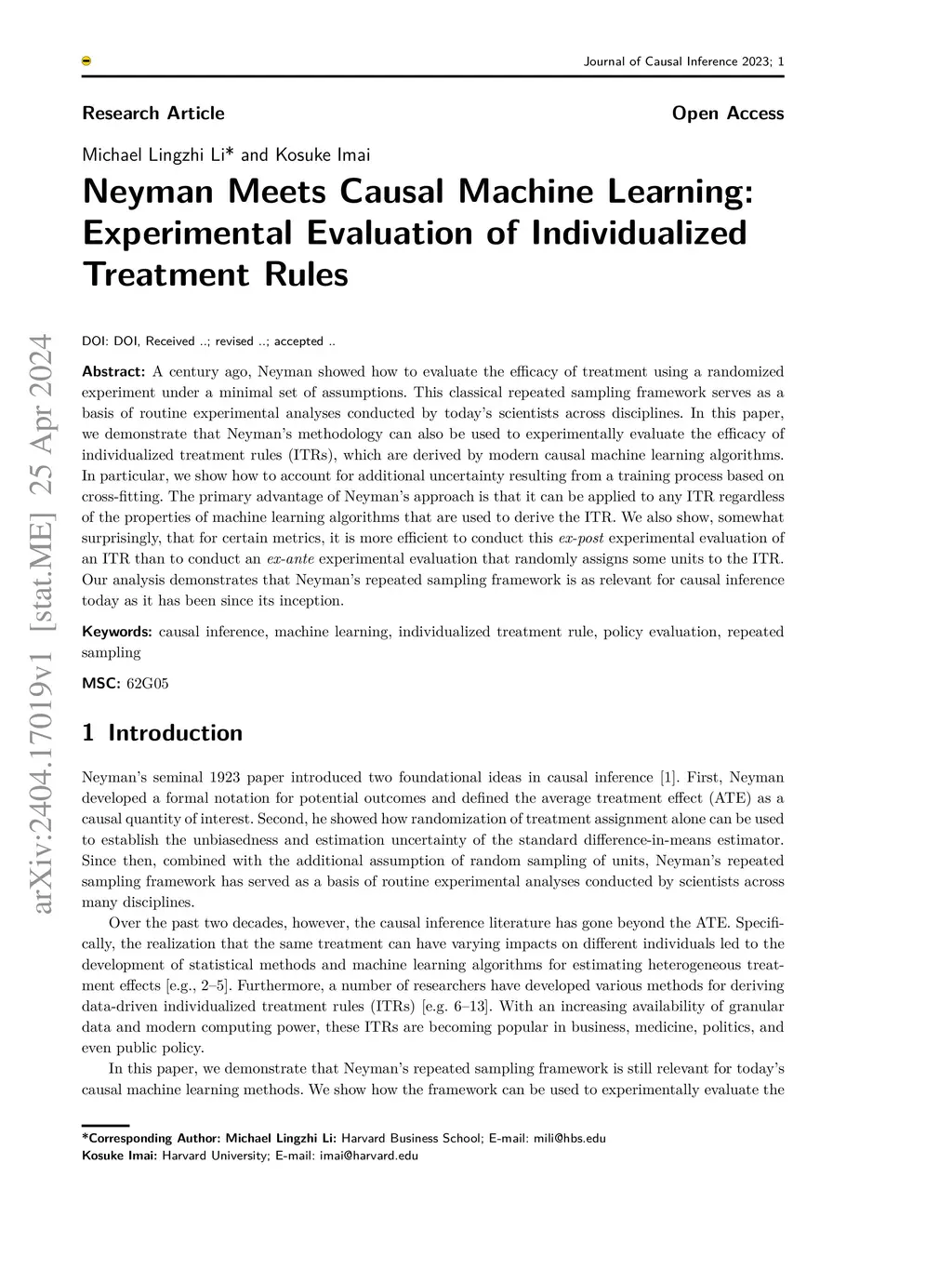 A century ago, Neyman showed how to evaluate the efficacy of treatment using a randomized experiment under a minimal set of assumptions. This classical repeated sampling framework serves as a basis of routine experimental analyses conducted by today's scientists across disciplines. In this paper, we demonstrate that Neyman's methodology can also be used to experimentally evaluate the efficacy of individualized treatment rules (ITRs), which are derived by modern causal machine learning algorithms. In particular, we show how to account for additional uncertainty resulting from a training process based on cross-fitting. The primary advantage of Neyman's approach is that it can be applied to any ITR regardless of the properties of machine learning algorithms that are used to derive the ITR. We also show, somewhat surprisingly, that for certain metrics, it is more efficient to conduct this ex-post experimental evaluation of an ITR than to conduct an ex-ante experimental evaluation that randomly assigns some units to the ITR. Our analysis demonstrates that Neyman's repeated sampling framework is as relevant for causal inference today as it has been since its inception.