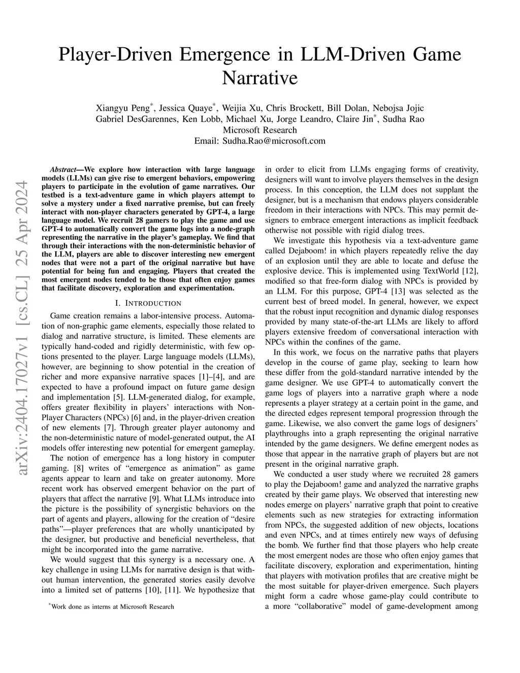 We explore how interaction with large language models (LLMs) can give rise to emergent behaviors, empowering players to participate in the evolution of game narratives. Our testbed is a text-adventure game in which players attempt to solve a mystery under a fixed narrative premise, but can freely interact with non-player characters generated by GPT-4, a large language model. We recruit 28 gamers to play the game and use GPT-4 to automatically convert the game logs into a node-graph representing the narrative in the player's gameplay. We find that through their interactions with the non-deterministic behavior of the LLM, players are able to discover interesting new emergent nodes that were not a part of the original narrative but have potential for being fun and engaging. Players that created the most emergent nodes tended to be those that often enjoy games that facilitate discovery, exploration and experimentation.