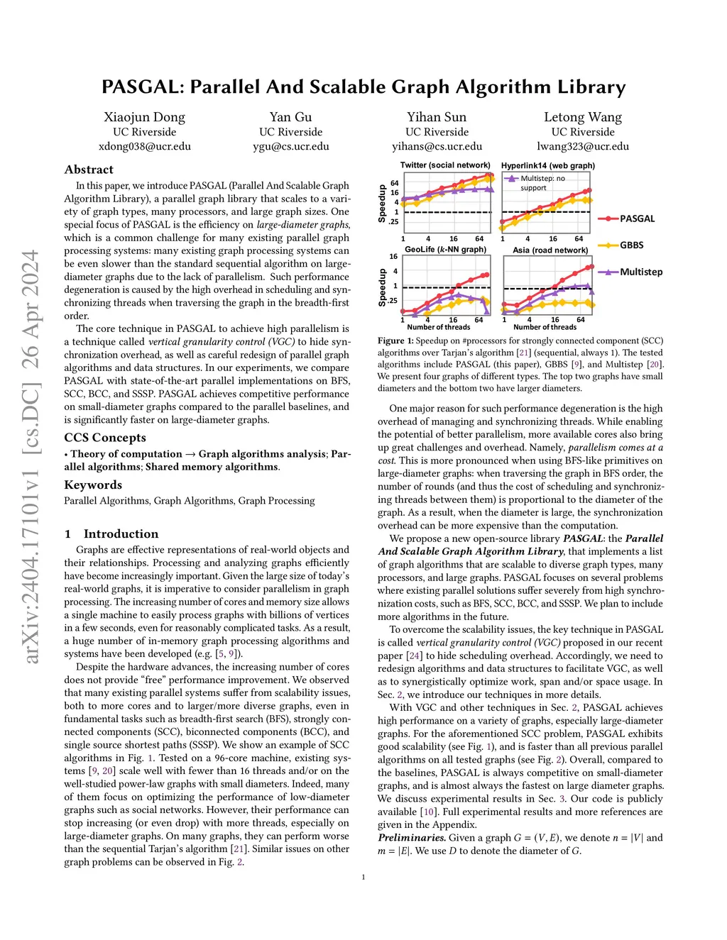 In this paper, we introduce PASGAL (Parallel And Scalable Graph Algorithm Library), a parallel graph library that scales to a variety of graph types, many processors, and large graph sizes. One special focus of PASGAL is the efficiency on \textit{large-diameter graphs}, which is a common challenge for many existing parallel graph processing systems: many existing graph processing systems can be even slower than the standard sequential algorithm on large-diameter graphs due to the lack of parallelism. Such performance degeneration is caused by the high overhead in scheduling and synchronizing threads when traversing the graph in the breadth-first order. The core technique in PASGAL to achieve high parallelism is a technique called \textit{vertical granularity control (VGC)} to hide synchronization overhead, as well as careful redesign of parallel graph algorithms and data structures. In our experiments, we compare PASGAL with state-of-the-art parallel implementations on BFS, SCC, BCC, and SSSP. PASGAL achieves competitive performance on small-diameter graphs compared to the parallel baselines, and is significantly faster on large-diameter graphs.