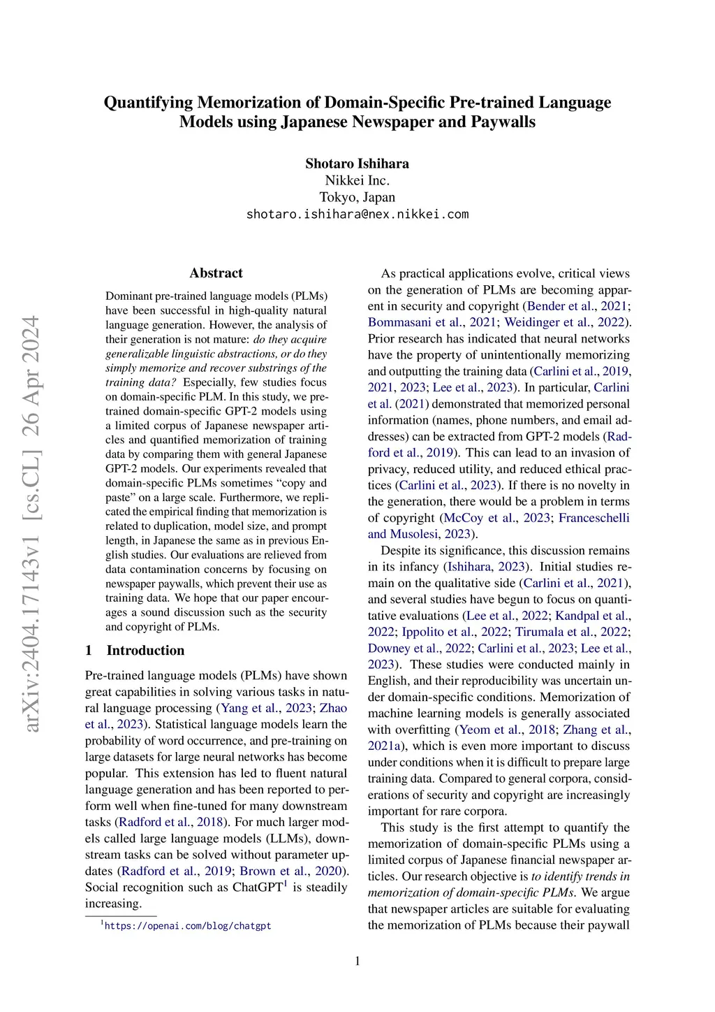 Dominant pre-trained language models (PLMs) have been successful in high-quality natural language generation. However, the analysis of their generation is not mature: do they acquire generalizable linguistic abstractions, or do they simply memorize and recover substrings of the training data? Especially, few studies focus on domain-specific PLM. In this study, we pre-trained domain-specific GPT-2 models using a limited corpus of Japanese newspaper articles and quantified memorization of training data by comparing them with general Japanese GPT-2 models. Our experiments revealed that domain-specific PLMs sometimes "copy and paste" on a large scale. Furthermore, we replicated the empirical finding that memorization is related to duplication, model size, and prompt length, in Japanese the same as in previous English studies. Our evaluations are relieved from data contamination concerns by focusing on newspaper paywalls, which prevent their use as training data. We hope that our paper encourages a sound discussion such as the security and copyright of PLMs.