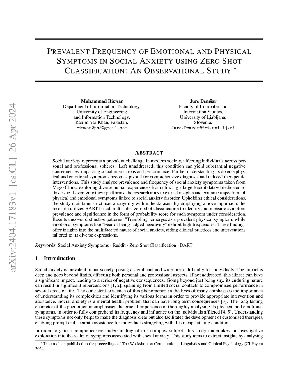 Social anxiety represents a prevalent challenge in modern society, affecting individuals across personal and professional spheres. Left unaddressed, this condition can yield substantial negative consequences, impacting social interactions and performance. Further understanding its diverse physical and emotional symptoms becomes pivotal for comprehensive diagnosis and tailored therapeutic interventions. This study analyze prevalence and frequency of social anxiety symptoms taken from Mayo Clinic, exploring diverse human experiences from utilizing a large Reddit dataset dedicated to this issue. Leveraging these platforms, the research aims to extract insights and examine a spectrum of physical and emotional symptoms linked to social anxiety disorder. Upholding ethical considerations, the study maintains strict user anonymity within the dataset. By employing a novel approach, the research utilizes BART-based multi-label zero-shot classification to identify and measure symptom prevalence and significance in the form of probability score for each symptom under consideration. Results uncover distinctive patterns: "Trembling" emerges as a prevalent physical symptom, while emotional symptoms like "Fear of being judged negatively" exhibit high frequencies. These findings offer insights into the multifaceted nature of social anxiety, aiding clinical practices and interventions tailored to its diverse expressions.