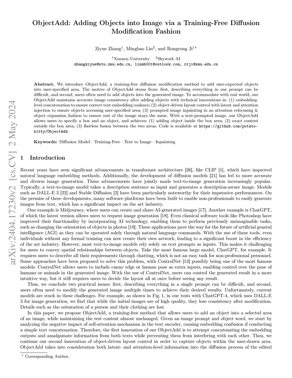 We introduce ObjectAdd, a training-free diffusion modification method to add user-expected objects into user-specified area. The motive of ObjectAdd stems from: first, describing everything in one prompt can be difficult, and second, users often need to add objects into the generated image. To accommodate with real world, our ObjectAdd maintains accurate image consistency after adding objects with technical innovations in: (1) embedding-level concatenation to ensure correct text embedding coalesce; (2) object-driven layout control with latent and attention injection to ensure objects accessing user-specified area; (3) prompted image inpainting in an attention refocusing & object expansion fashion to ensure rest of the image stays the same. With a text-prompted image, our ObjectAdd allows users to specify a box and an object, and achieves: (1) adding object inside the box area; (2) exact content outside the box area; (3) flawless fusion between the two areas