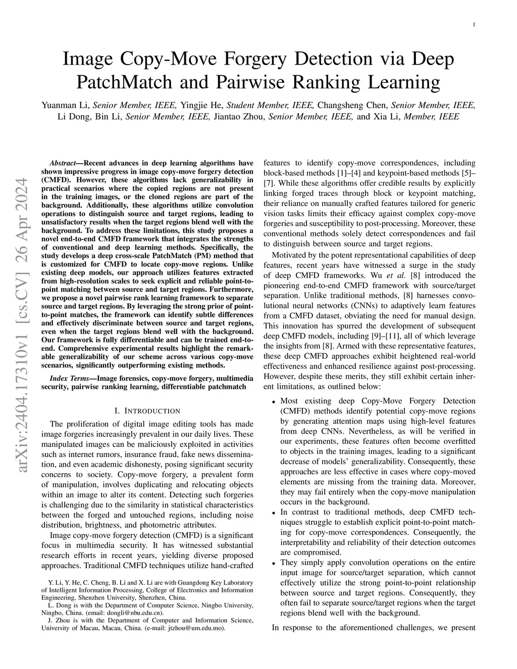 Recent advances in deep learning algorithms have shown impressive progress in image copy-move forgery detection (CMFD). However, these algorithms lack generalizability in practical scenarios where the copied regions are not present in the training images, or the cloned regions are part of the background. Additionally, these algorithms utilize convolution operations to distinguish source and target regions, leading to unsatisfactory results when the target regions blend well with the background. To address these limitations, this study proposes a novel end-to-end CMFD framework that integrates the strengths of conventional and deep learning methods. Specifically, the study develops a deep cross-scale PatchMatch (PM) method that is customized for CMFD to locate copy-move regions. Unlike existing deep models, our approach utilizes features extracted from high-resolution scales to seek explicit and reliable point-to-point matching between source and target regions. Furthermore, we propose a novel pairwise rank learning framework to separate source and target regions. By leveraging the strong prior of point-to-point matches, the framework can identify subtle differences and effectively discriminate between source and target regions, even when the target regions blend well with the background. Our framework is fully differentiable and can be trained end-to-end. Comprehensive experimental results highlight the remarkable generalizability of our scheme across various copy-move scenarios, significantly outperforming existing methods.
