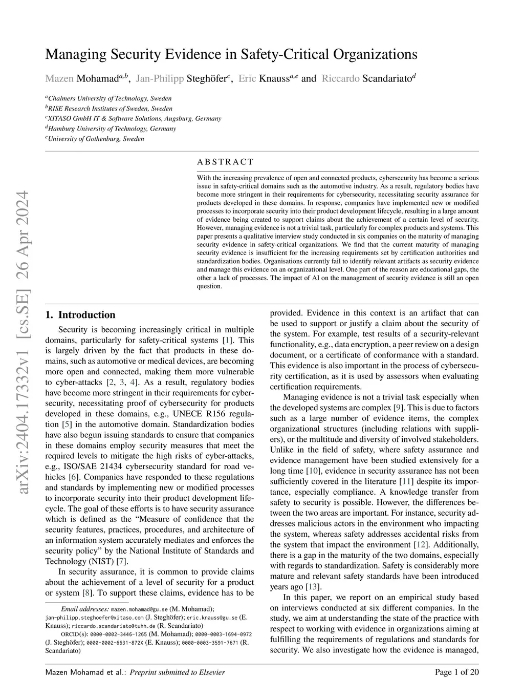 With the increasing prevalence of open and connected products, cybersecurity has become a serious issue in safety-critical domains such as the automotive industry. As a result, regulatory bodies have become more stringent in their requirements for cybersecurity, necessitating security assurance for products developed in these domains. In response, companies have implemented new or modified processes to incorporate security into their product development lifecycle, resulting in a large amount of evidence being created to support claims about the achievement of a certain level of security. However, managing evidence is not a trivial task, particularly for complex products and systems. This paper presents a qualitative interview study conducted in six companies on the maturity of managing security evidence in safety-critical organizations. We find that the current maturity of managing security evidence is insufficient for the increasing requirements set by certification authorities and standardization bodies. Organisations currently fail to identify relevant artifacts as security evidence and manage this evidence on an organizational level. One part of the reason are educational gaps, the other a lack of processes. The impact of AI on the management of security evidence is still an open question